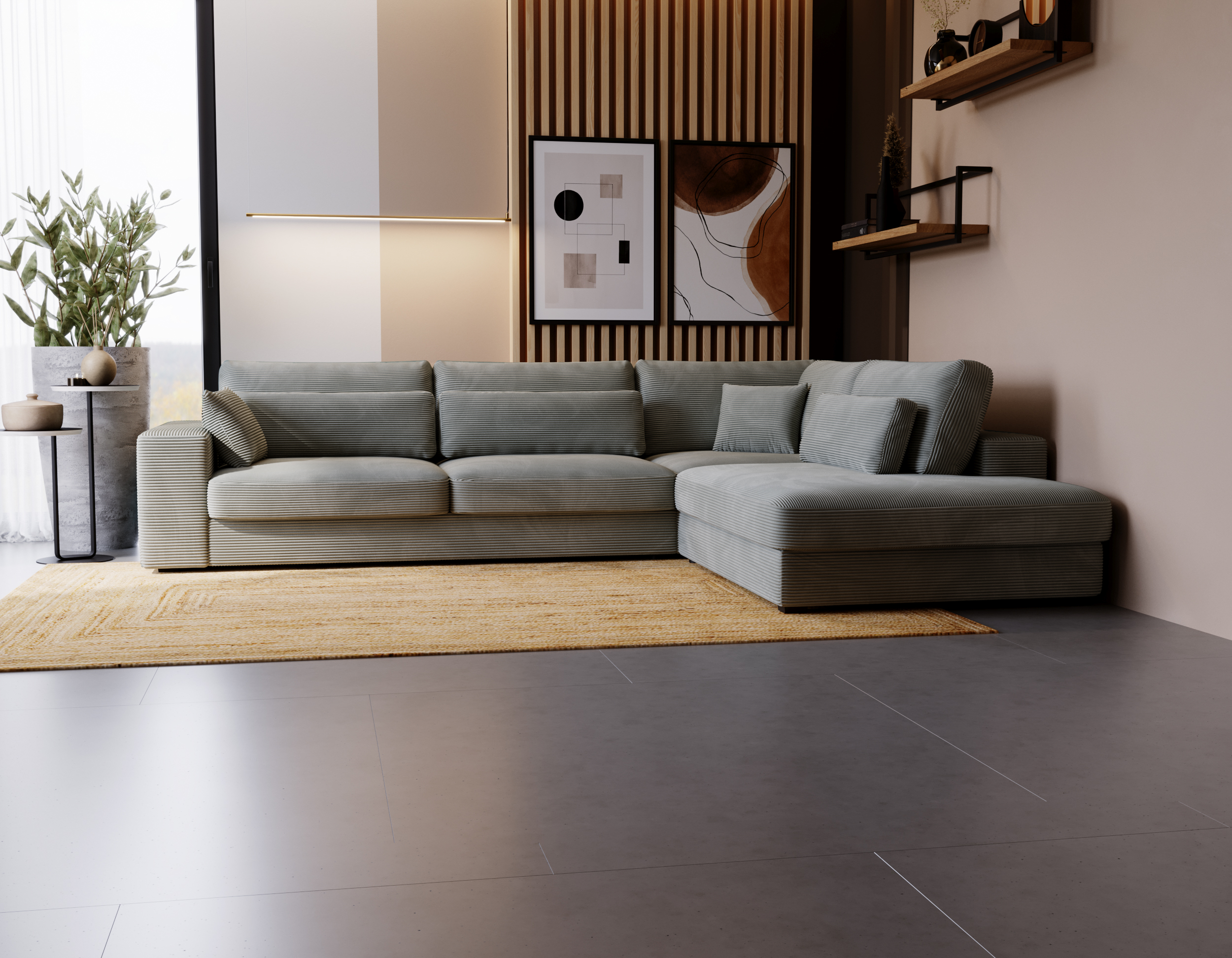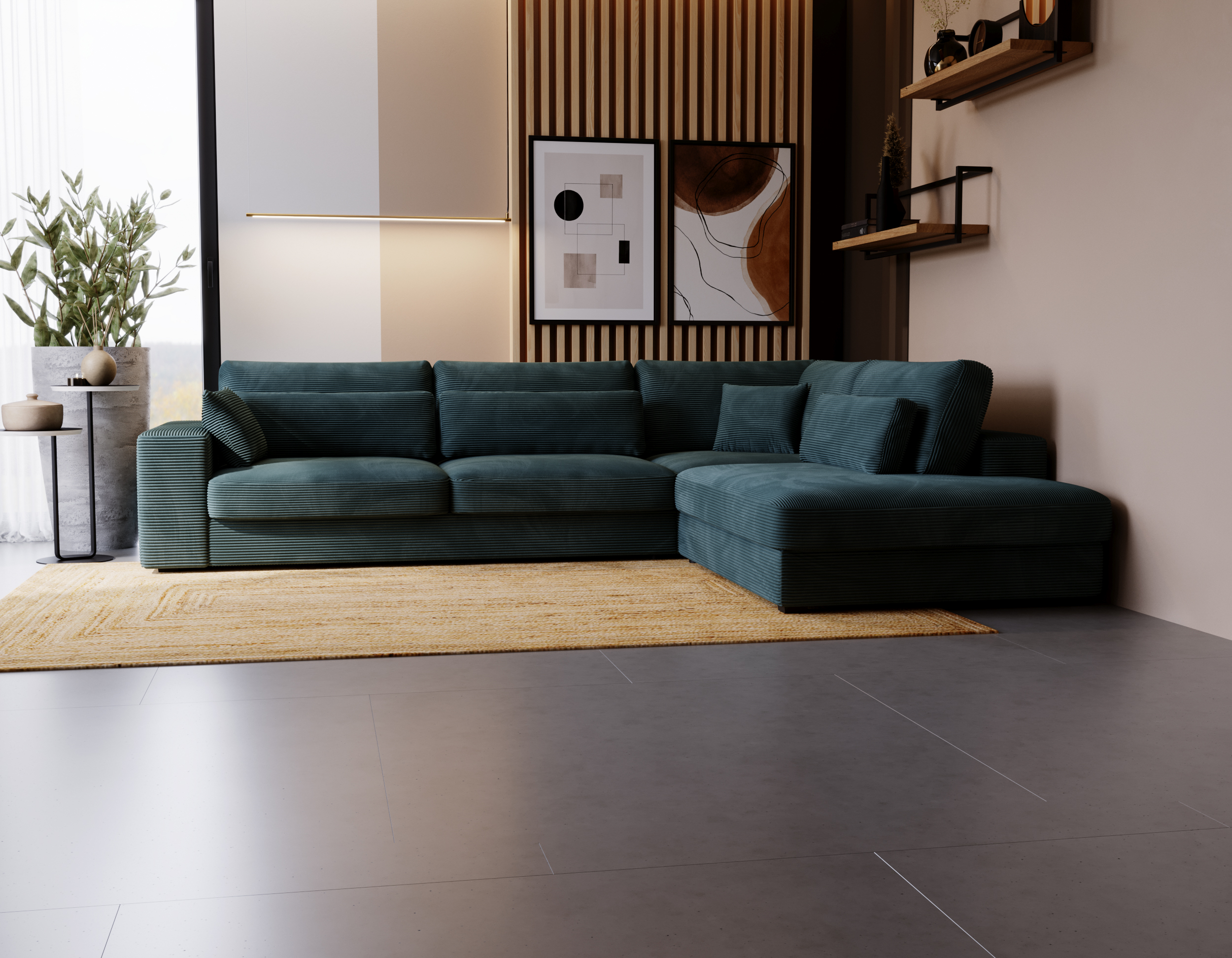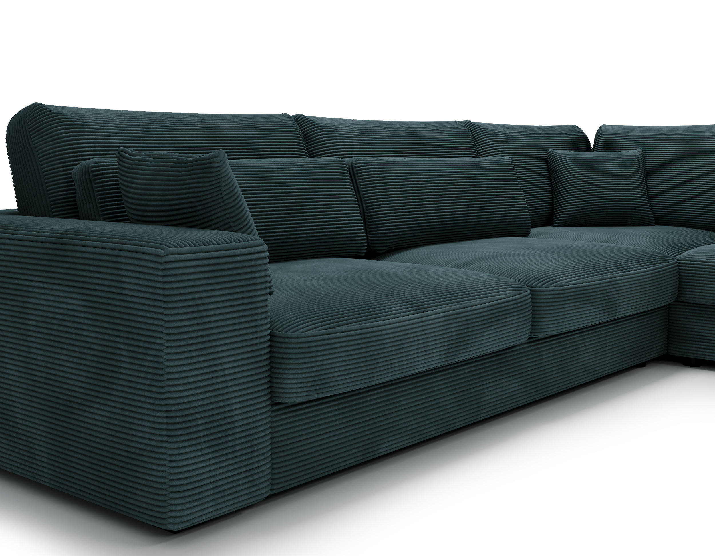 Narożnik Carmex to propozycja dla osób, które cenią przestronne formy, nowoczesny design i wysoki komfort codziennego wypoczynku. Uniwersalny kształt litery L sprawia, że doskonale odnajdzie się w dużym salonie, tworząc reprezentacyjną i wygodną strefę relaksu.