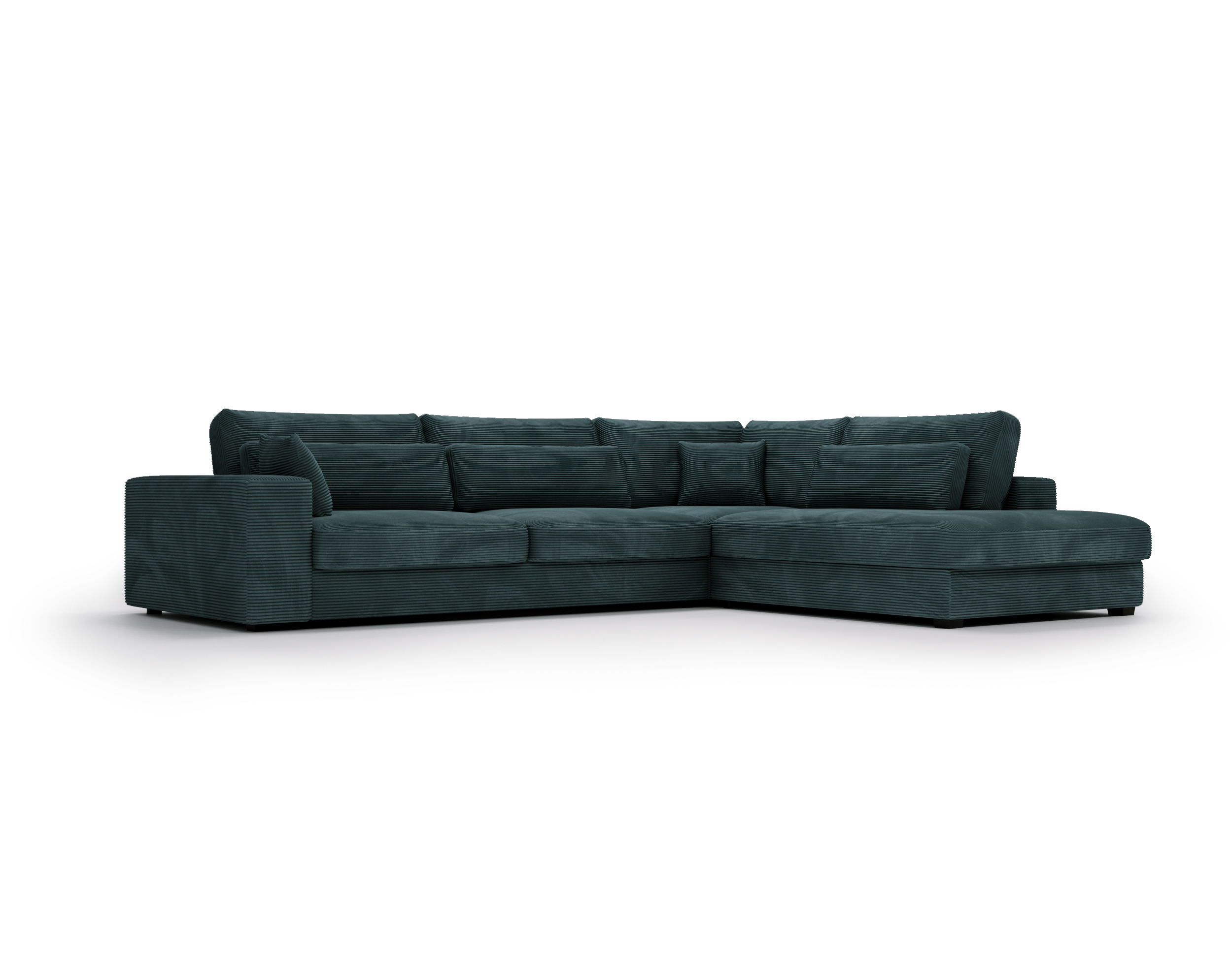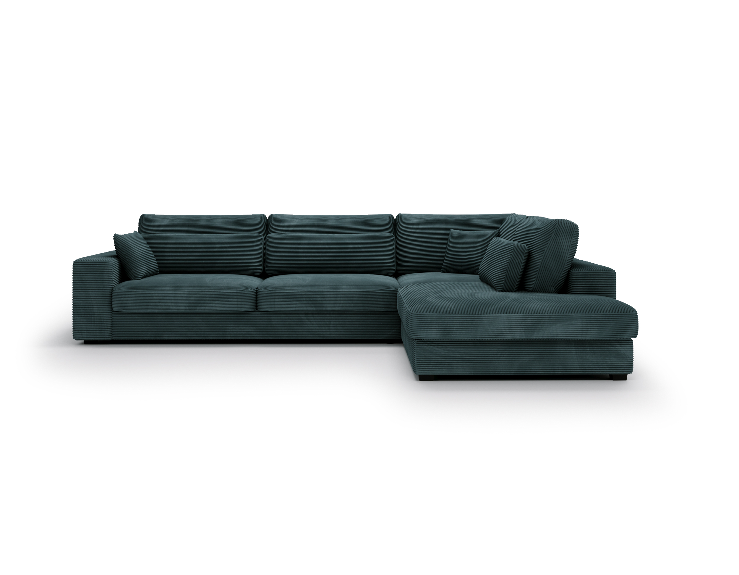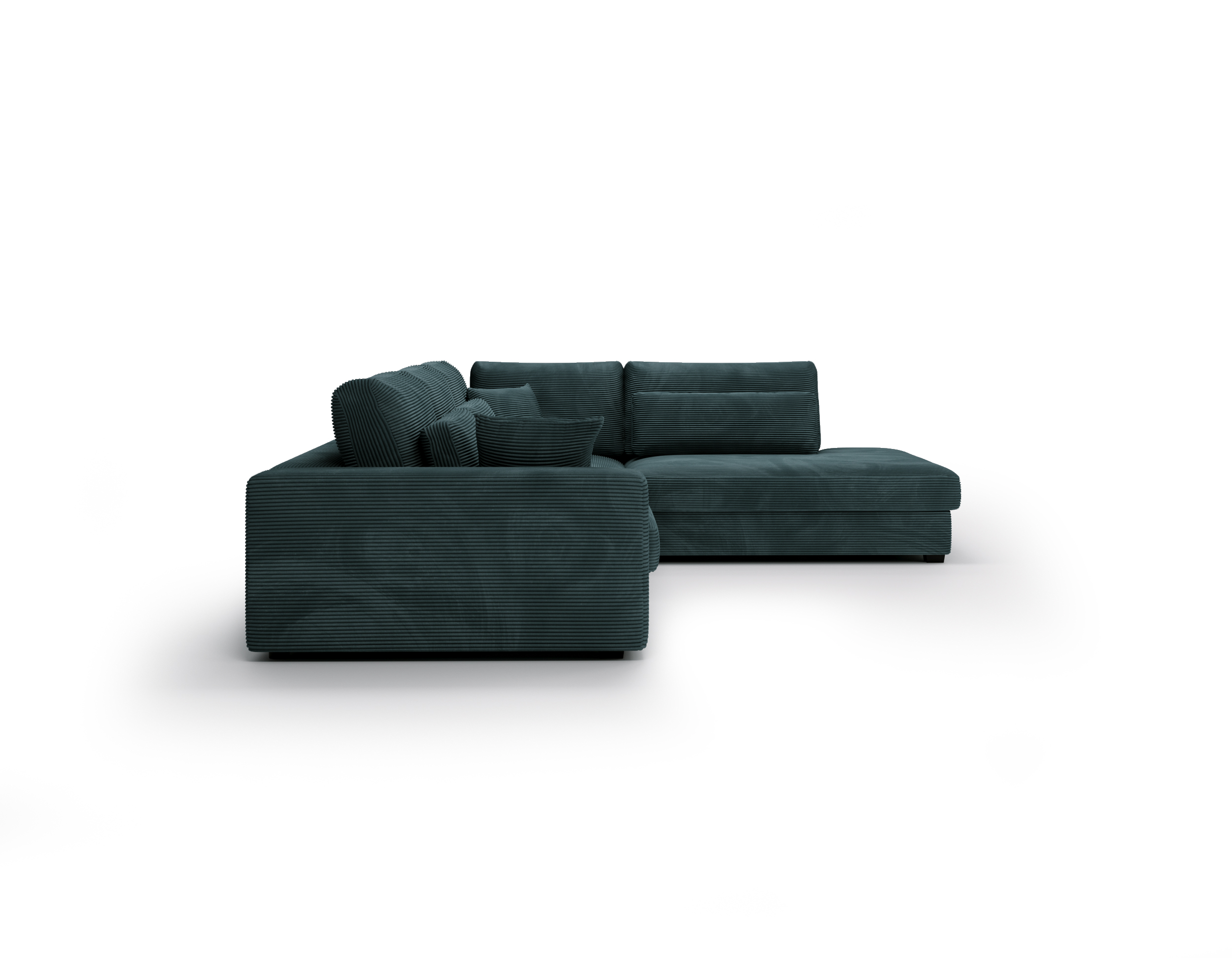 Narożnik dostępny jest w wersji prawo- lub lewostronnej, dzięki czemu łatwo dopasujesz go do układu swojego wnętrza. Tapicerowany tył pozwala ustawić mebel także na środku salonu, bez kompromisów estetycznych.