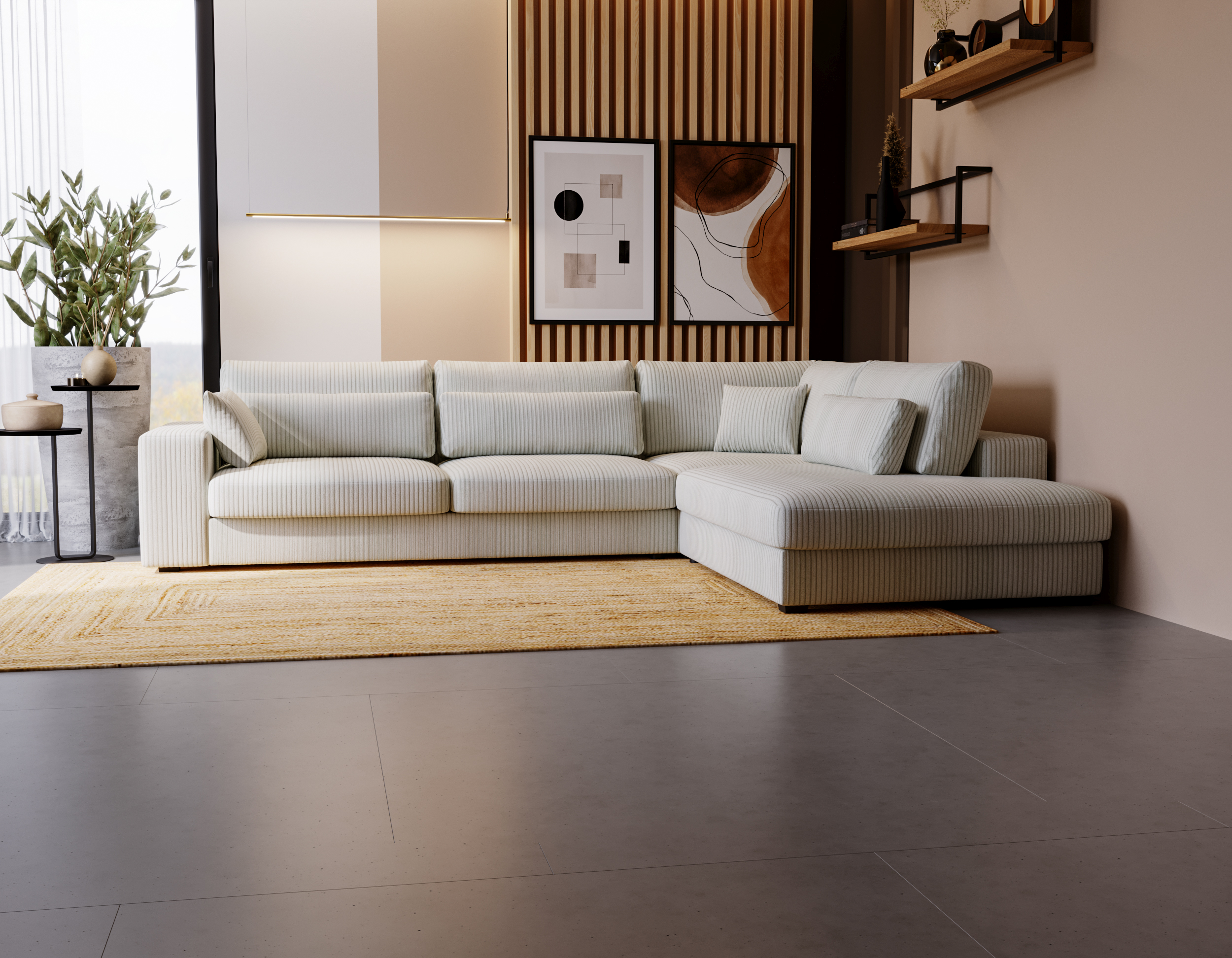 Narożnik Carmex w beżowym kolorze to propozycja dla osób, które cenią przestronne formy, nowoczesny design i wysoki komfort codziennego wypoczynku. Uniwersalny kształt litery L sprawia, że doskonale odnajdzie się w dużym salonie, tworząc reprezentacyjną i wygodną strefę relaksu.