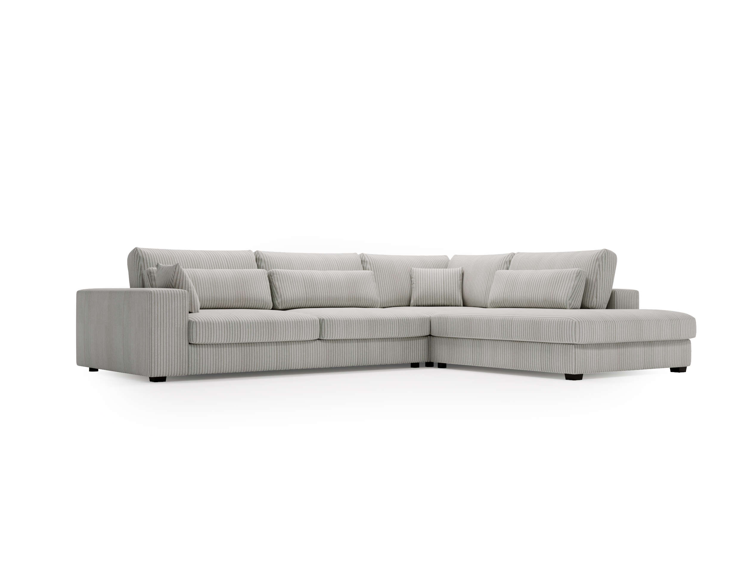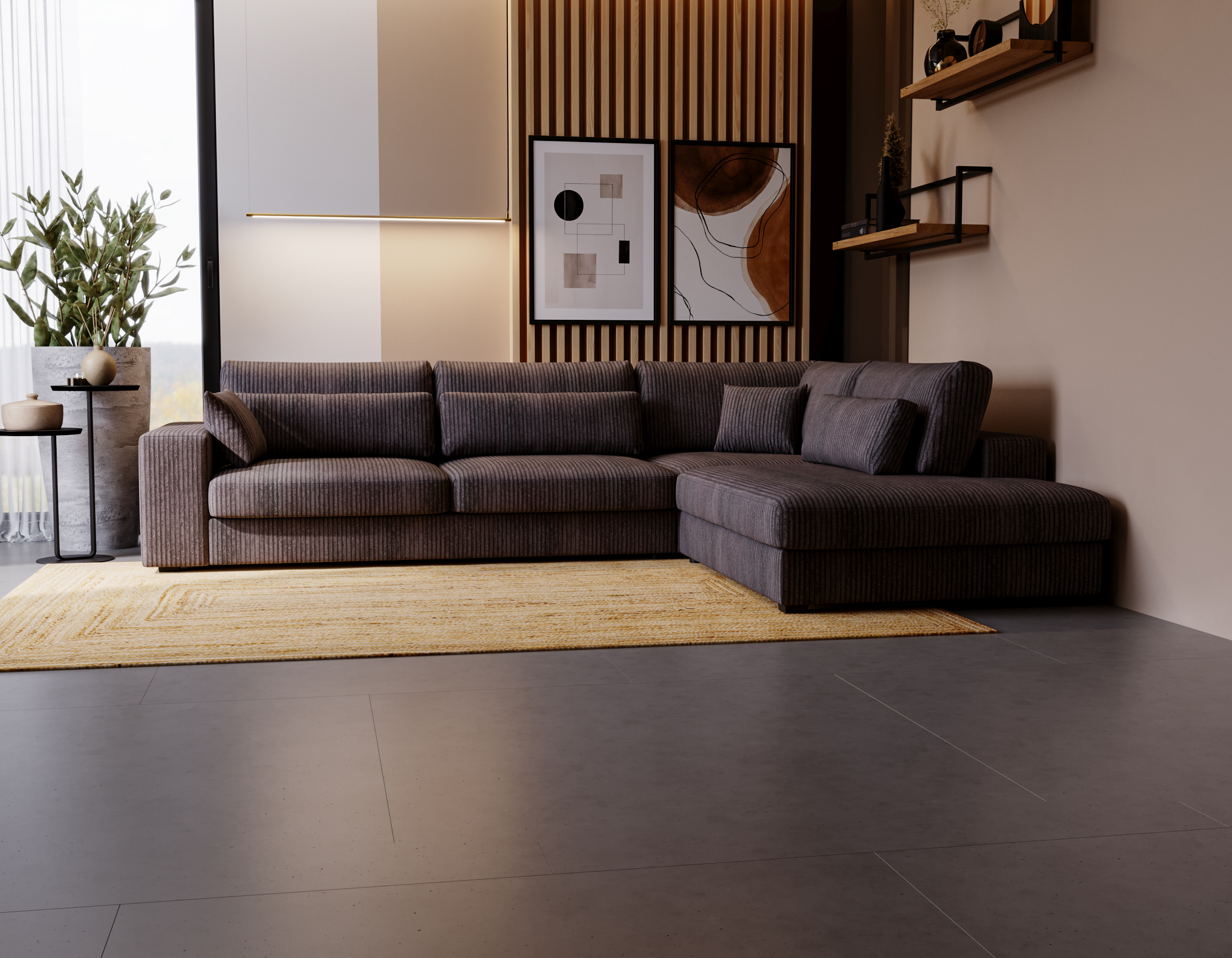 Narożnik dostępny jest w wersji prawo- lub lewostronnej, dzięki czemu łatwo dopasujesz go do układu swojego wnętrza. Tapicerowany tył pozwala ustawić mebel także na środku salonu, bez kompromisów estetycznych.