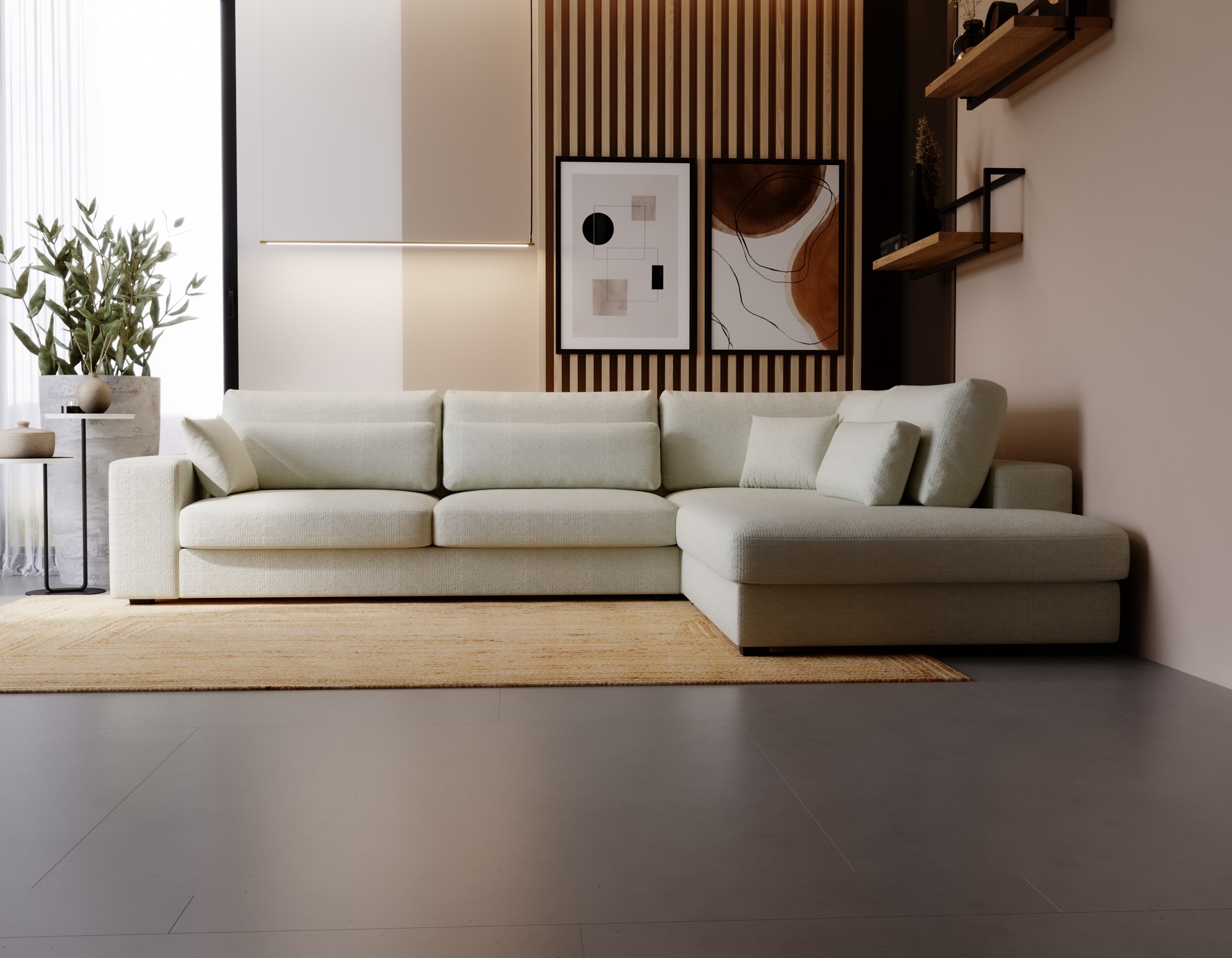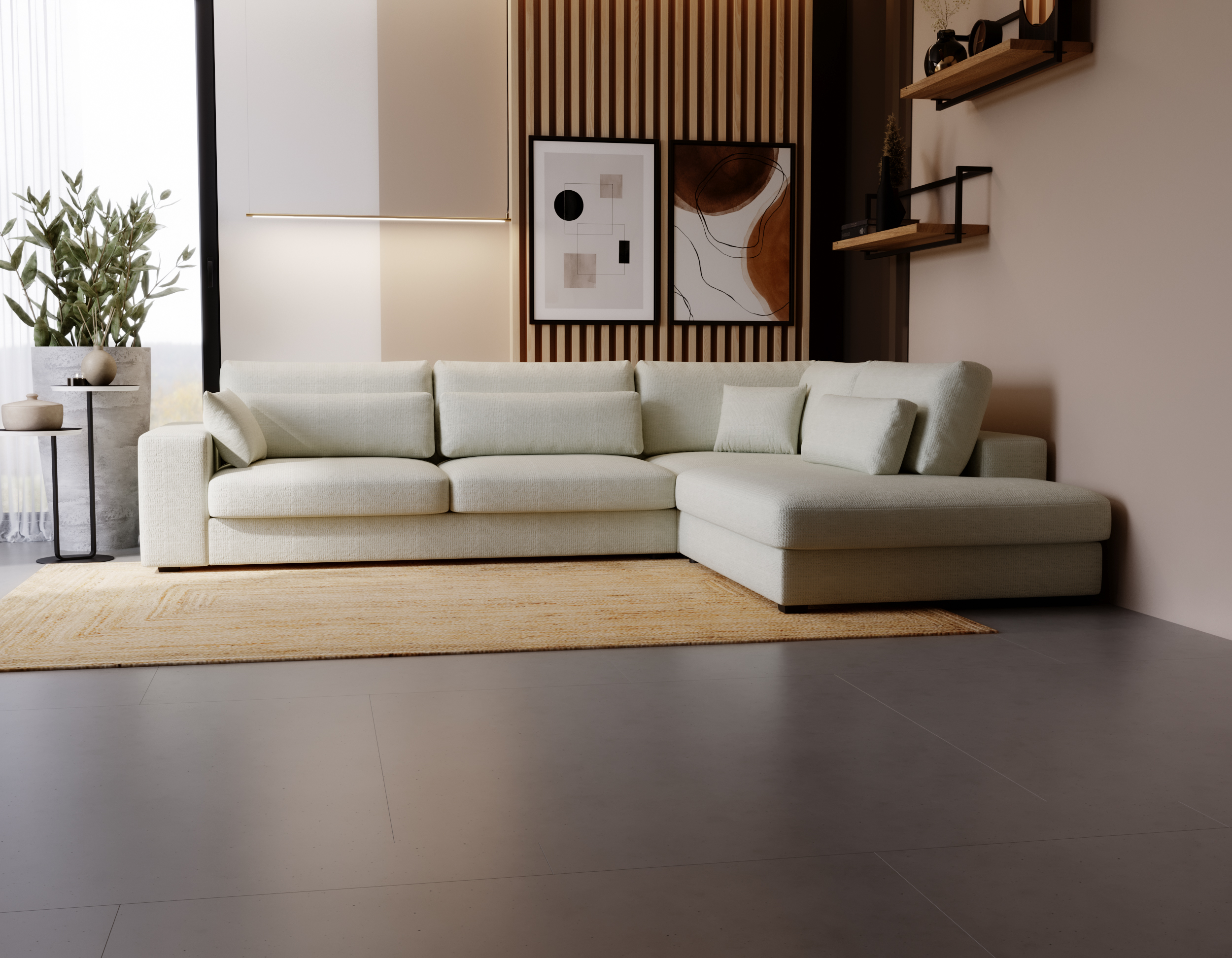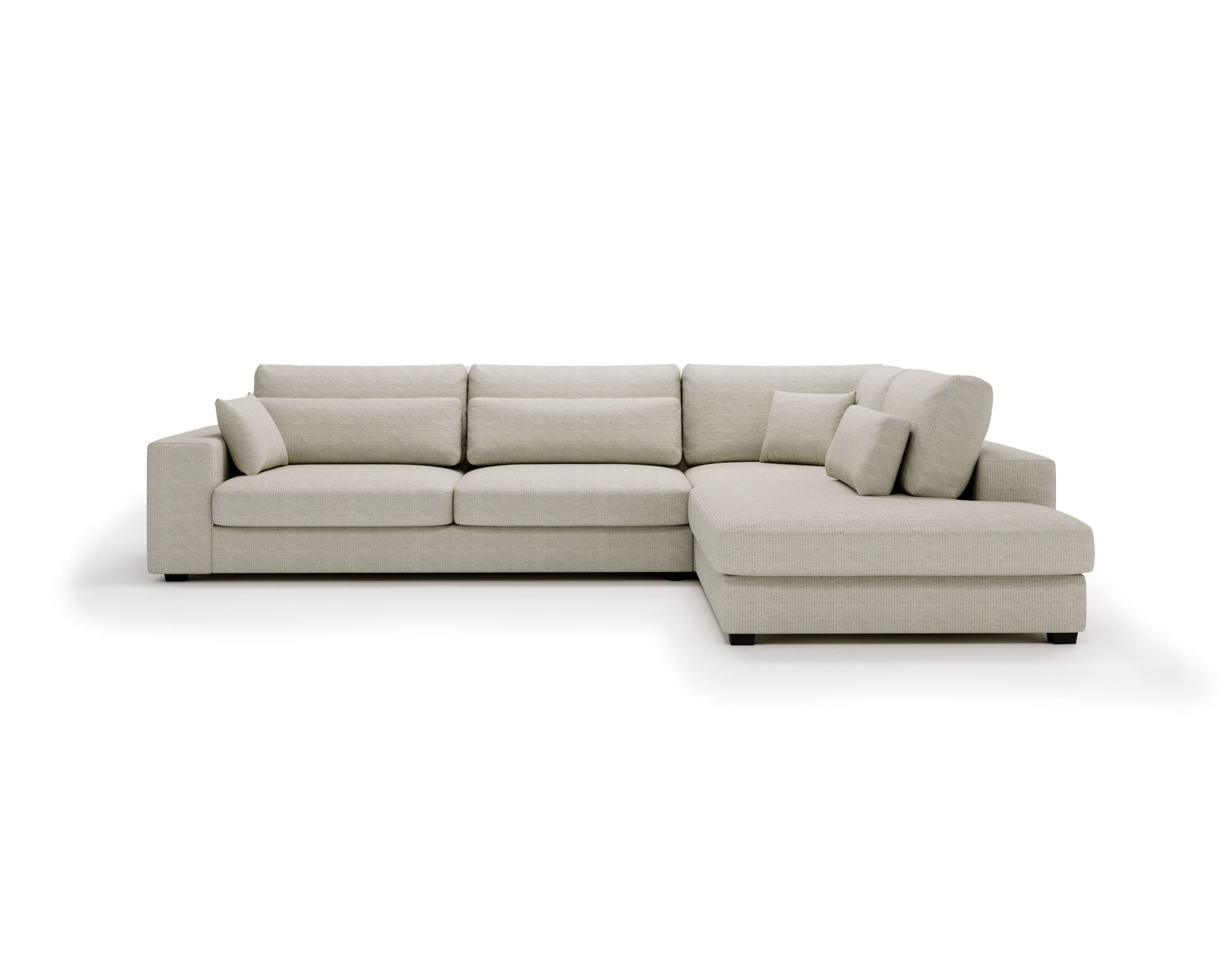 Narożnik Carmex w jasnobeżowym kolorze to propozycja dla osób, które cenią przestronne formy, nowoczesny design i wysoki komfort codziennego wypoczynku. Uniwersalny kształt litery L sprawia, że doskonale odnajdzie się w dużym salonie, tworząc reprezentacyjną i wygodną strefę relaksu.