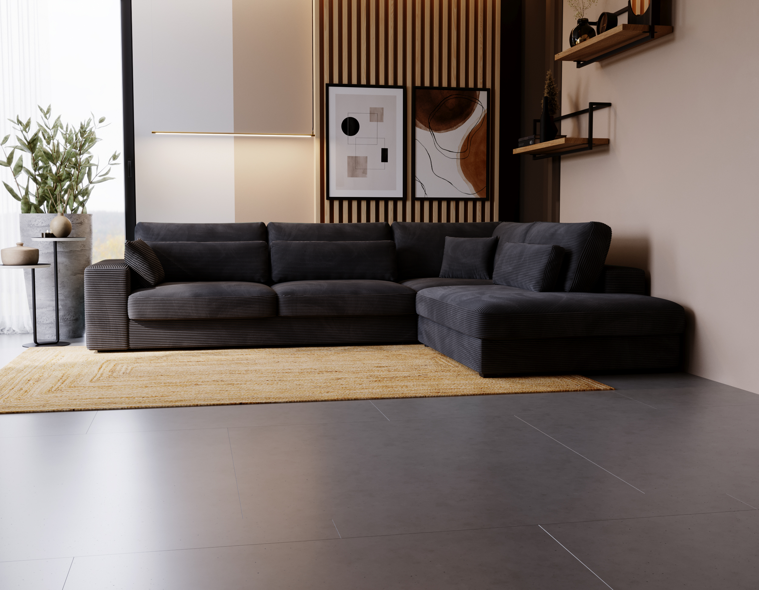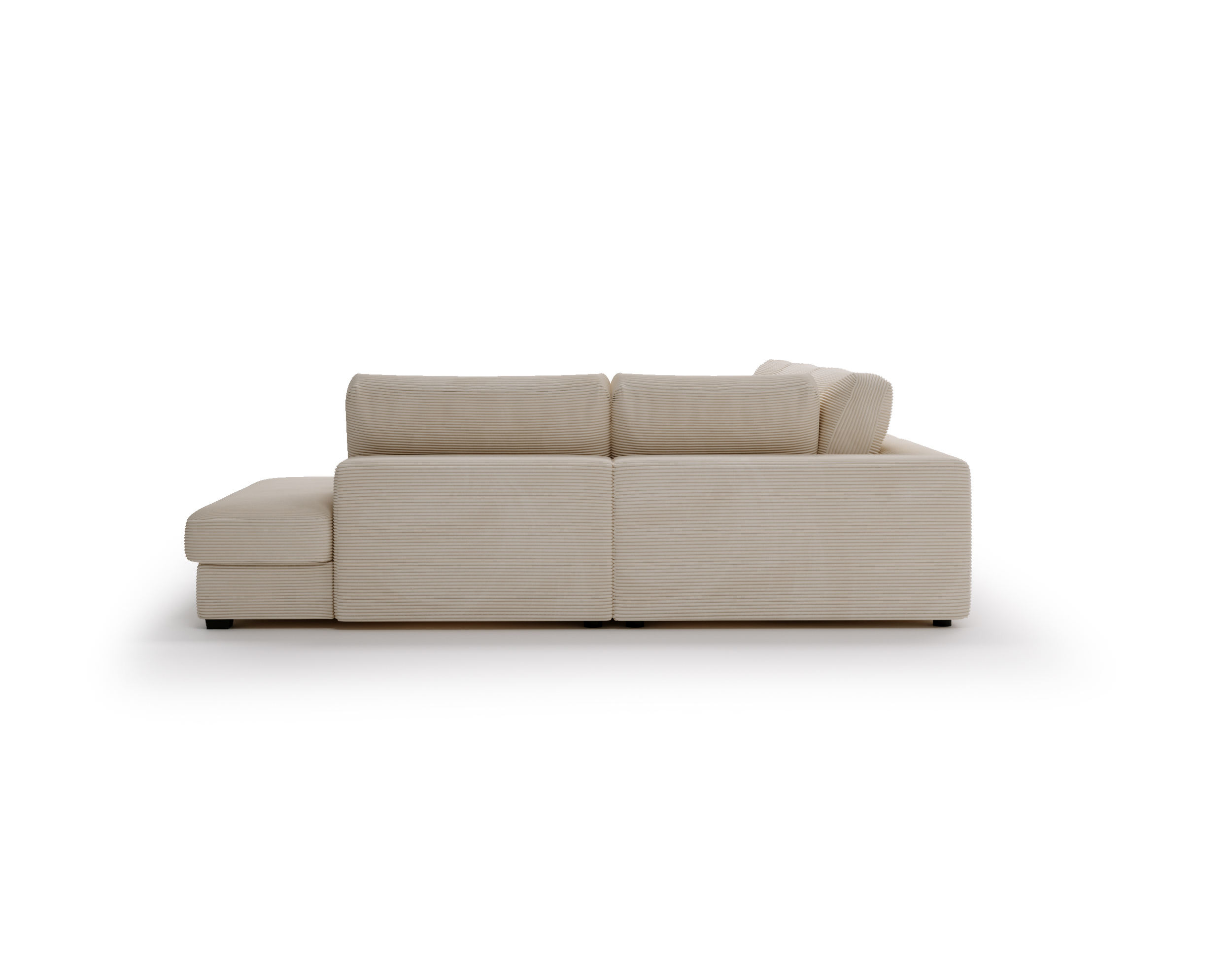 Narożnik dostępny jest w wersji prawo- lub lewostronnej, dzięki czemu łatwo dopasujesz go do układu swojego wnętrza. Tapicerowany tył pozwala ustawić mebel także na środku salonu, bez kompromisów estetycznych.