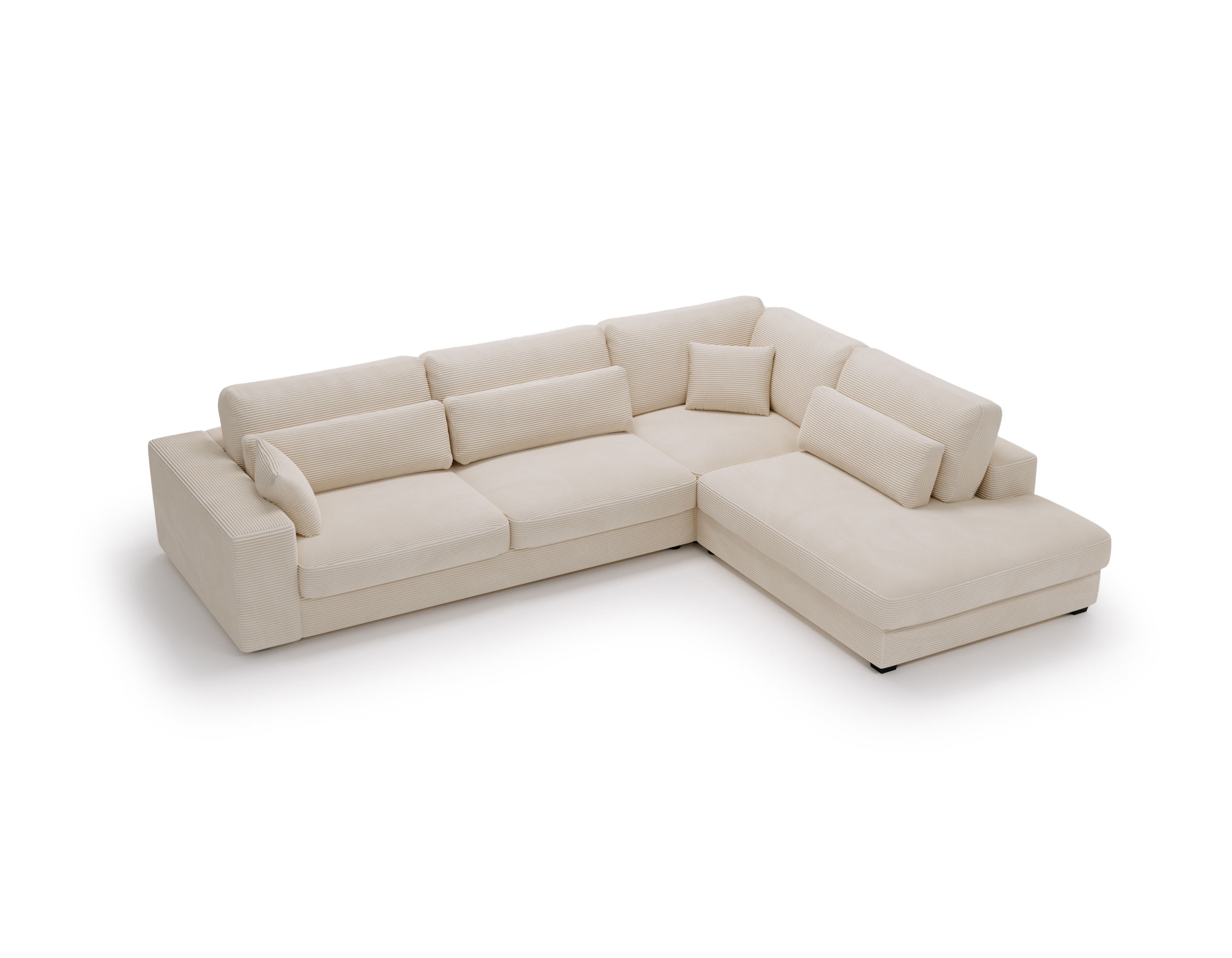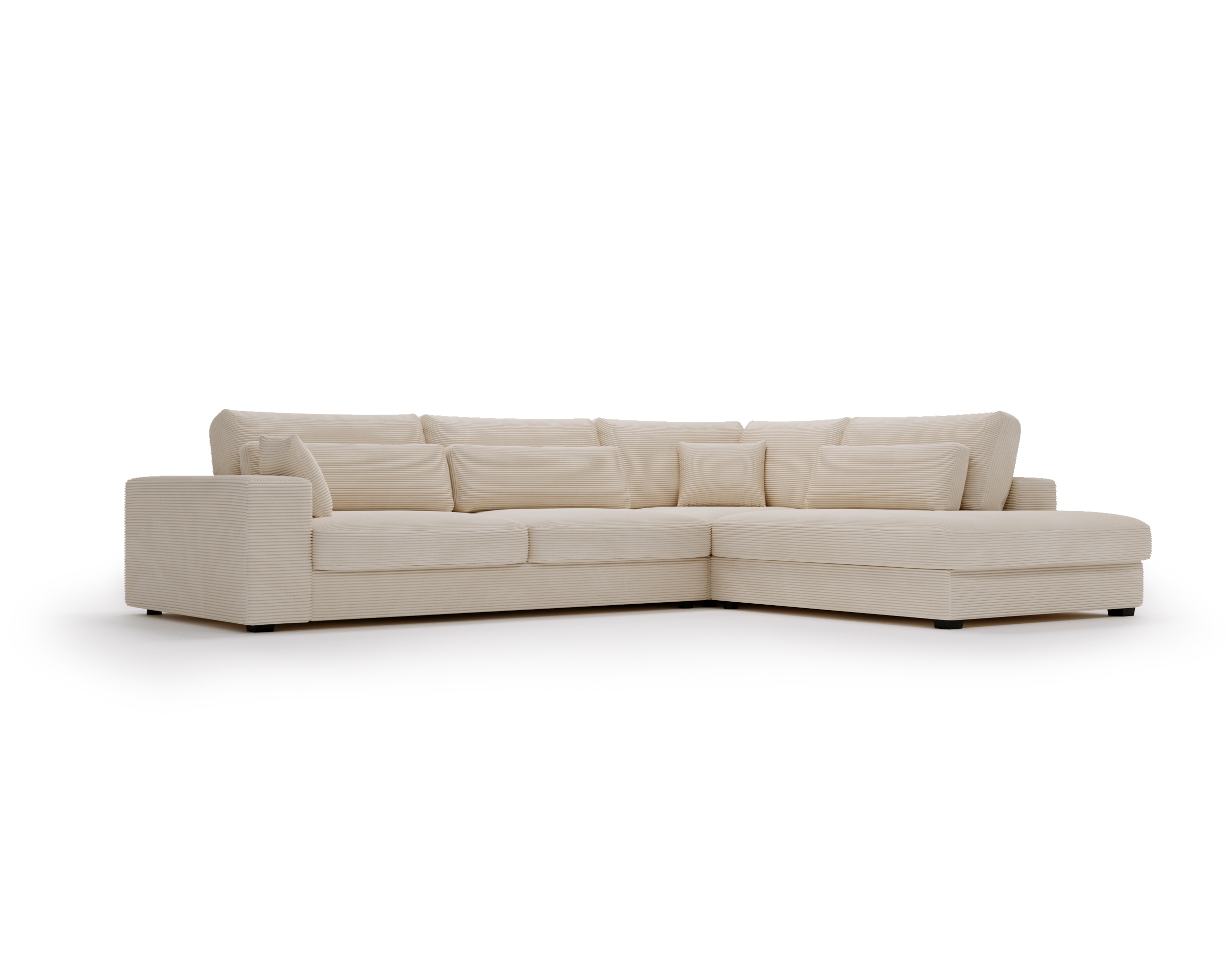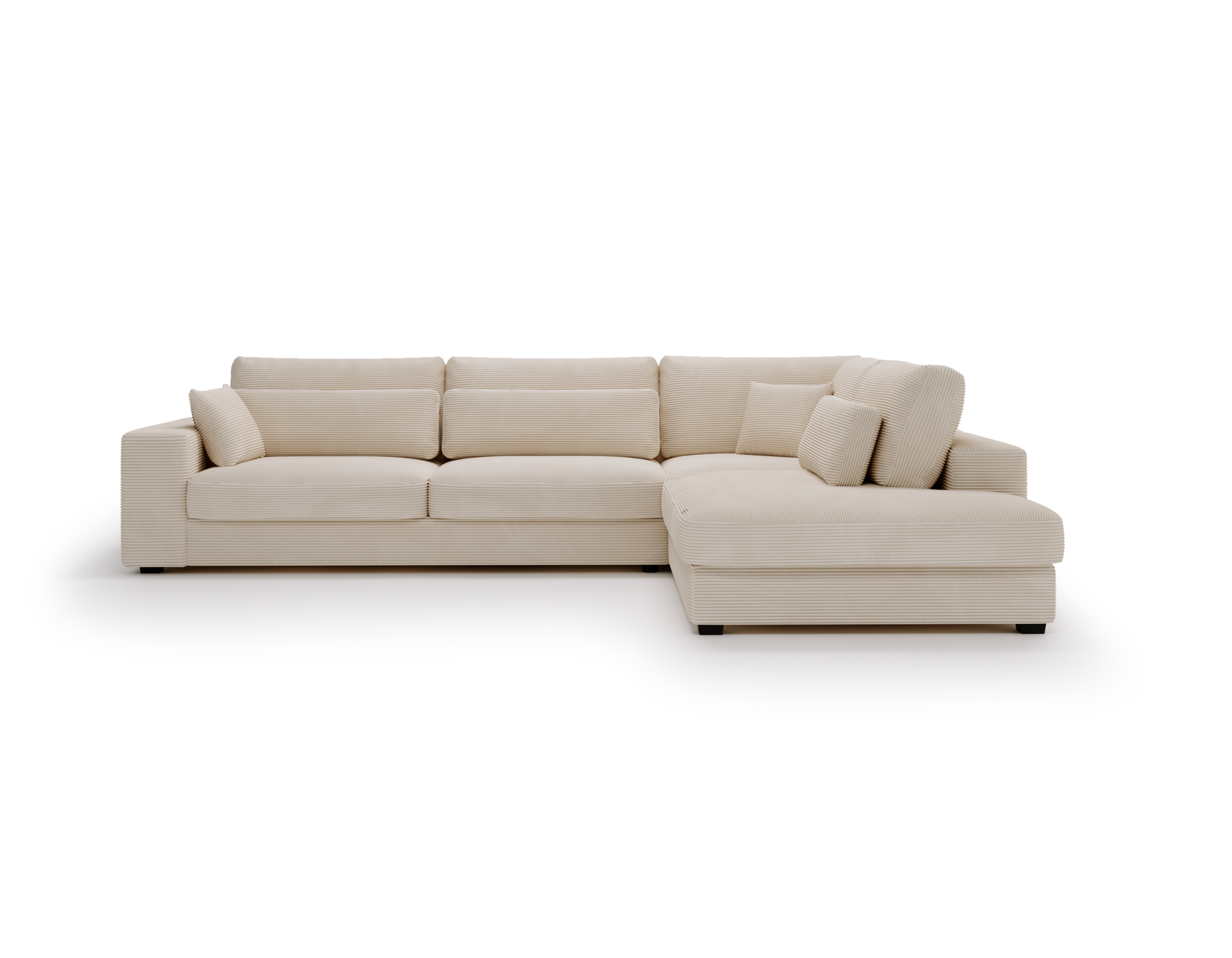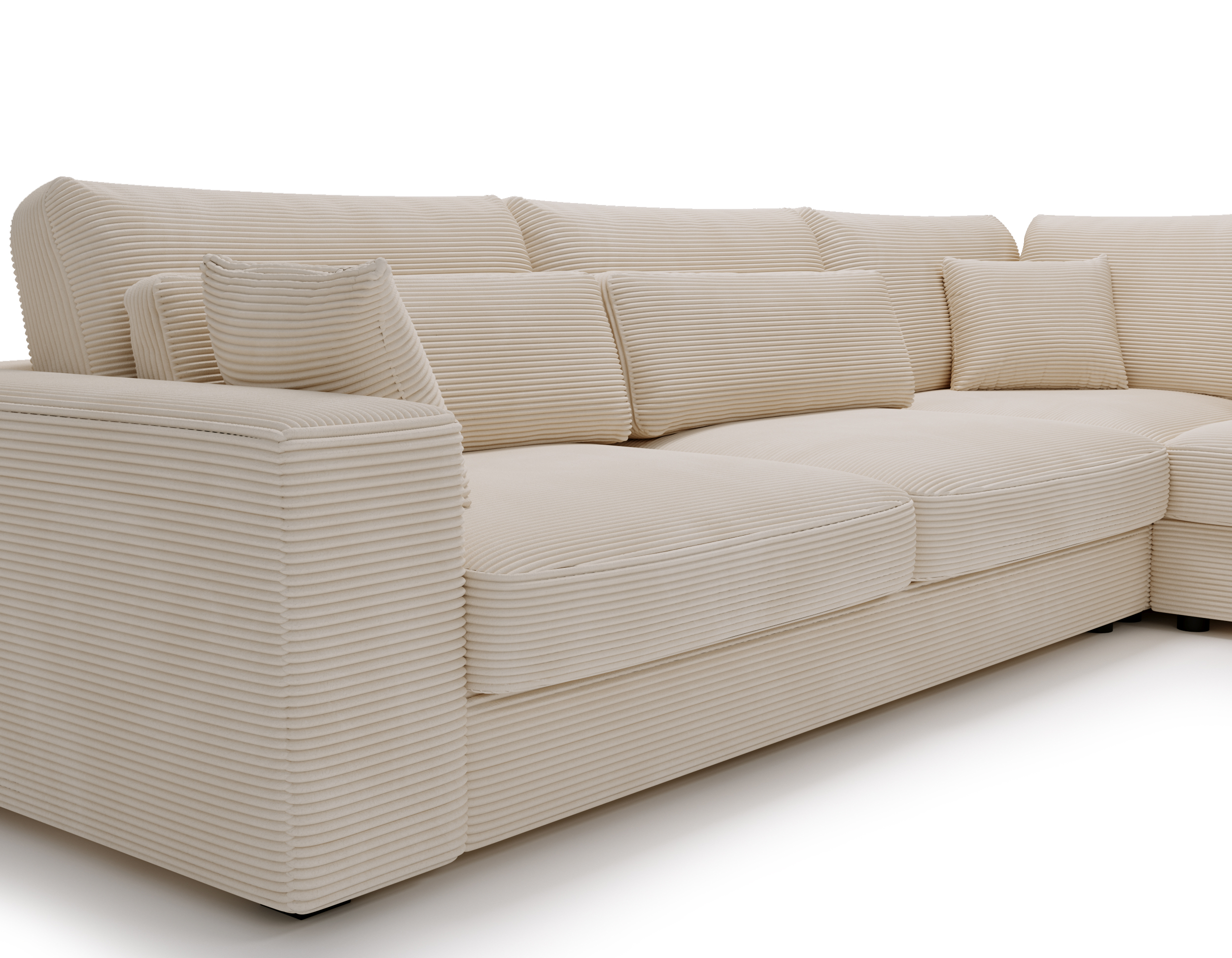 Narożnik Carmex w jasnobeżowym kolorze to propozycja dla osób, które cenią przestronne formy, nowoczesny design i wysoki komfort codziennego wypoczynku. Uniwersalny kształt litery L sprawia, że doskonale odnajdzie się w dużym salonie, tworząc reprezentacyjną i wygodną strefę relaksu.