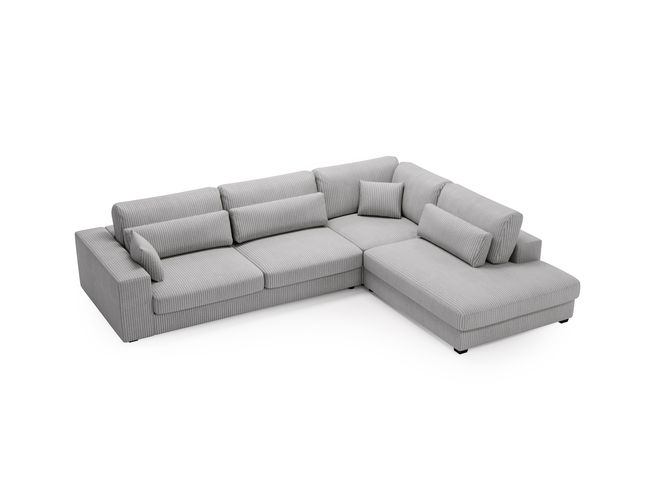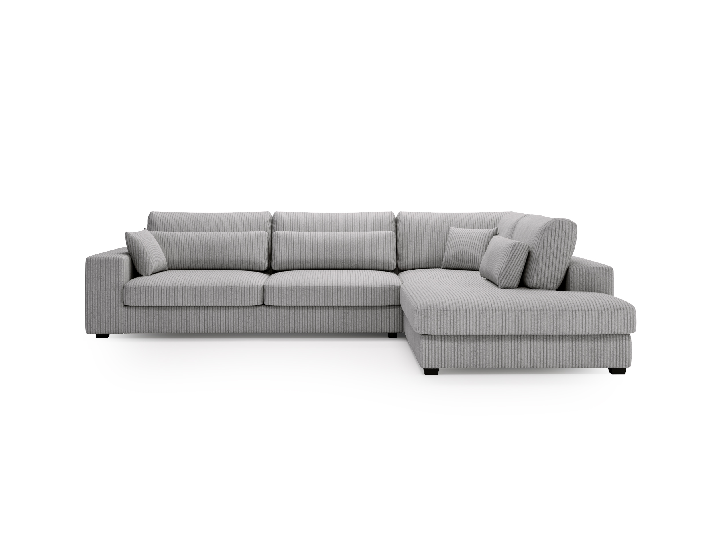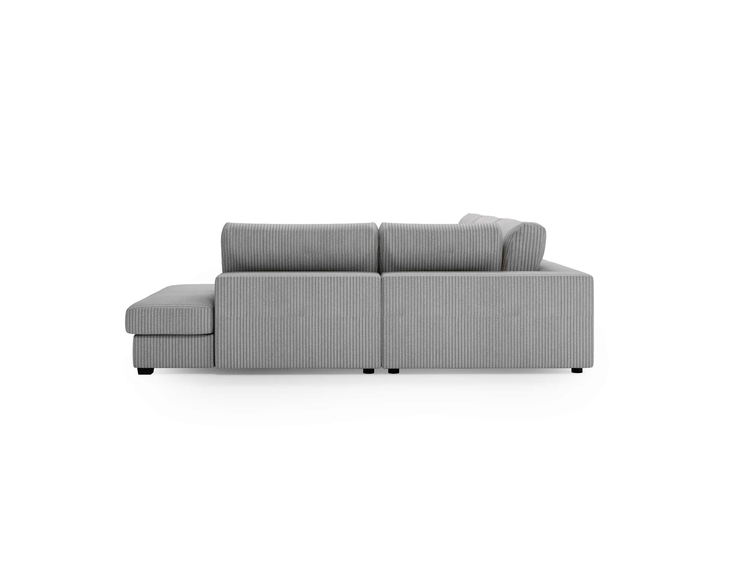 Narożnik dostępny jest w wersji prawo- lub lewostronnej, dzięki czemu łatwo dopasujesz go do układu swojego wnętrza. Tapicerowany tył pozwala ustawić mebel także na środku salonu, bez kompromisów estetycznych.