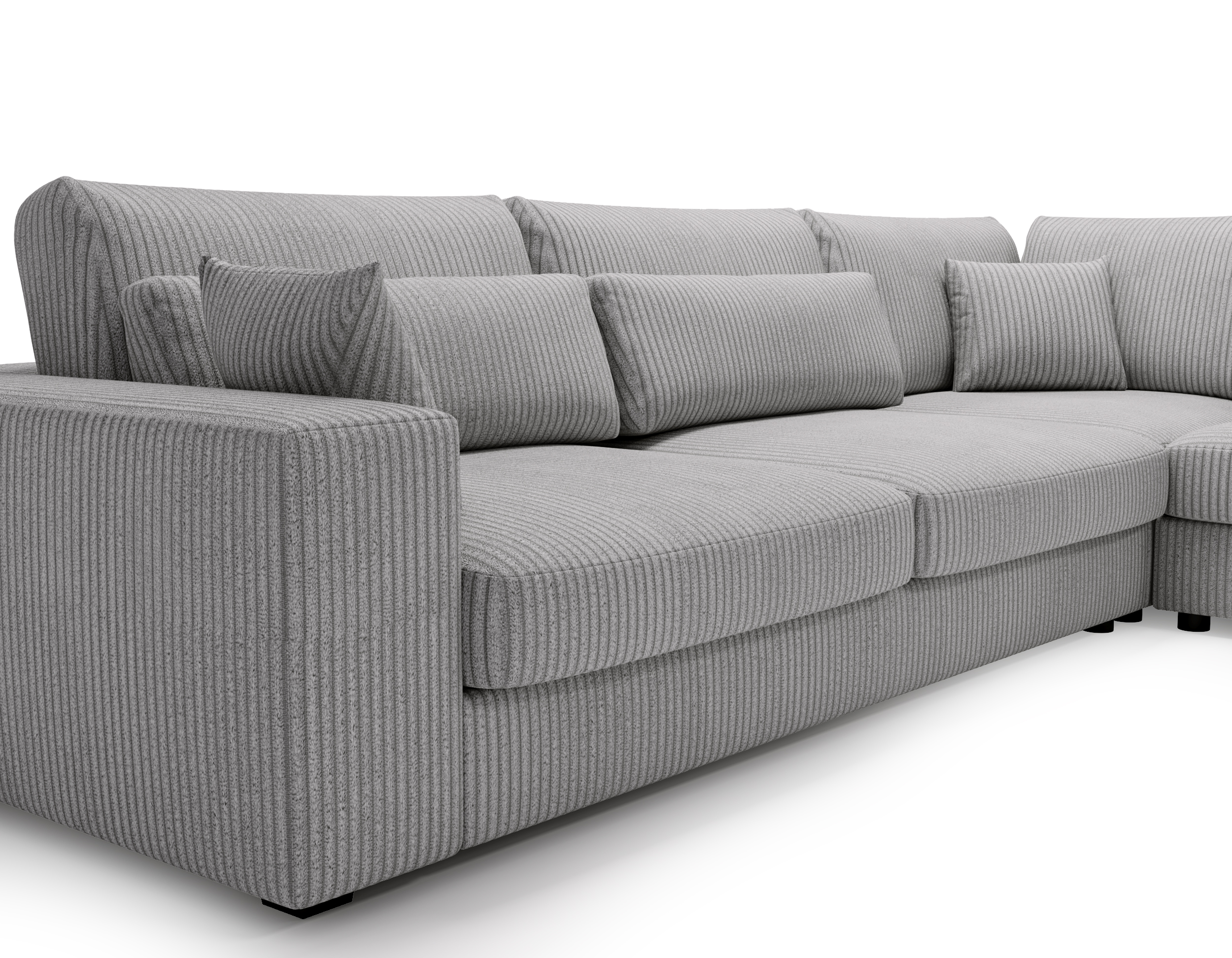 Narożnik Carmex nie posiada funkcji spania ani pojemnika na pościel – to idealny wybór dla osób, które stawiają na maksymalną wygodę i efektowny wygląd w strefie dziennej.