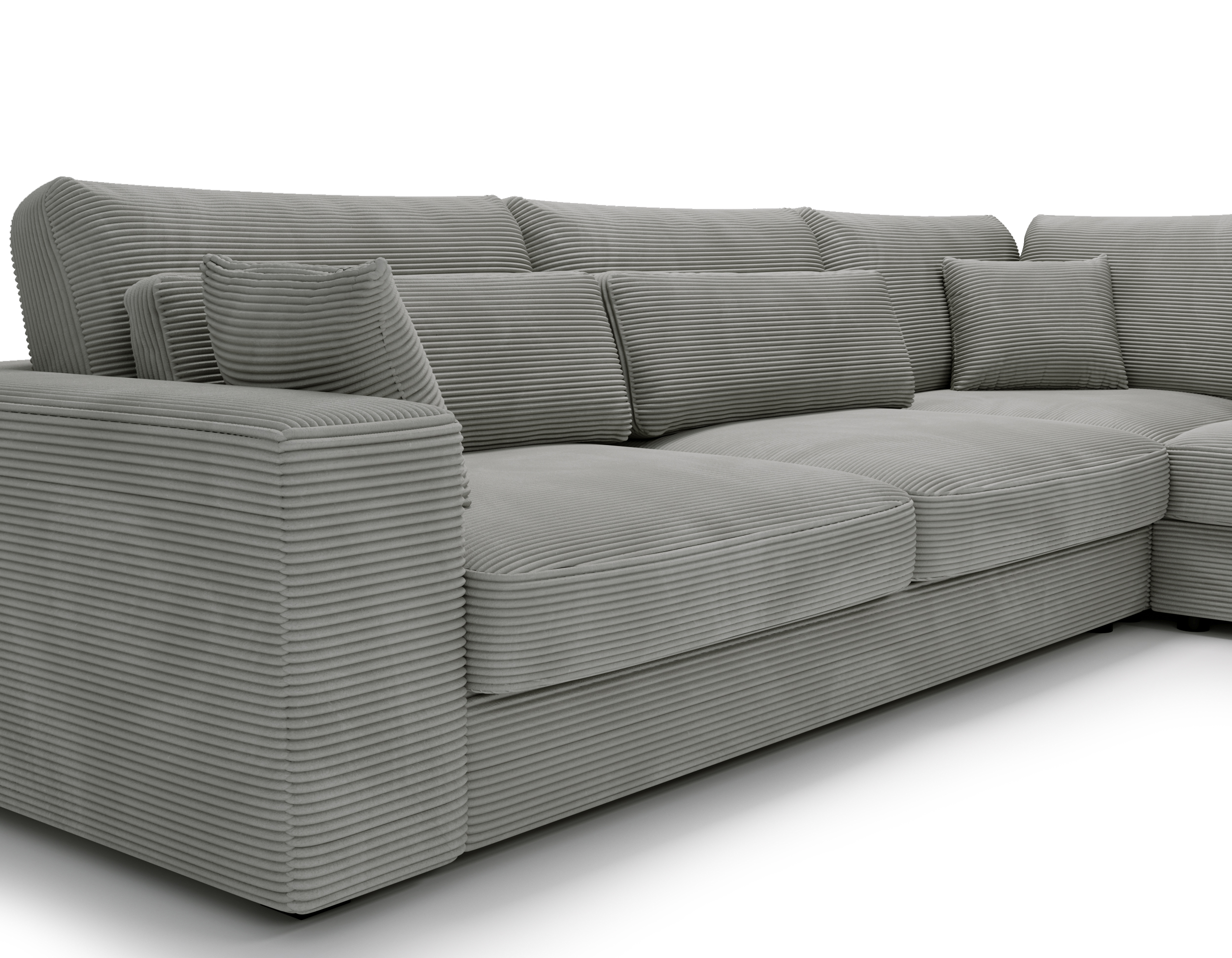 Narożnik Carmex nie posiada funkcji spania ani pojemnika na pościel – to idealny wybór dla osób, które stawiają na maksymalną wygodę i efektowny wygląd w strefie dziennej.