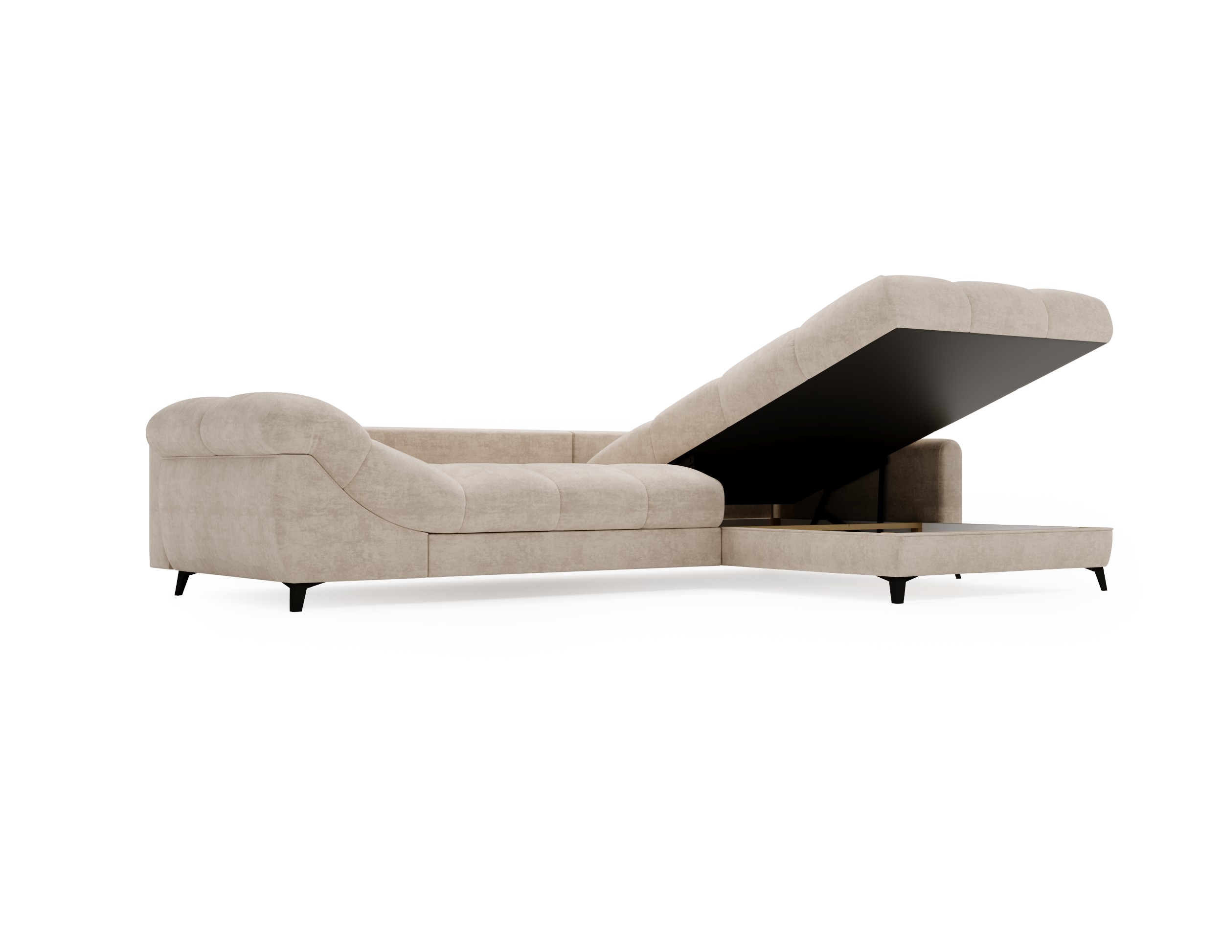 Narożnik Lettica łączy wysokiej jakości piankę poliuretanową z elementami drewna litego oraz płyty meblowej, co zapewnia trwałość i wygodę. Nóżki w kolorze czarnym matt dodają elegancji, a bogata paleta tkanin umożliwia dopasowanie do każdej aranżacji.