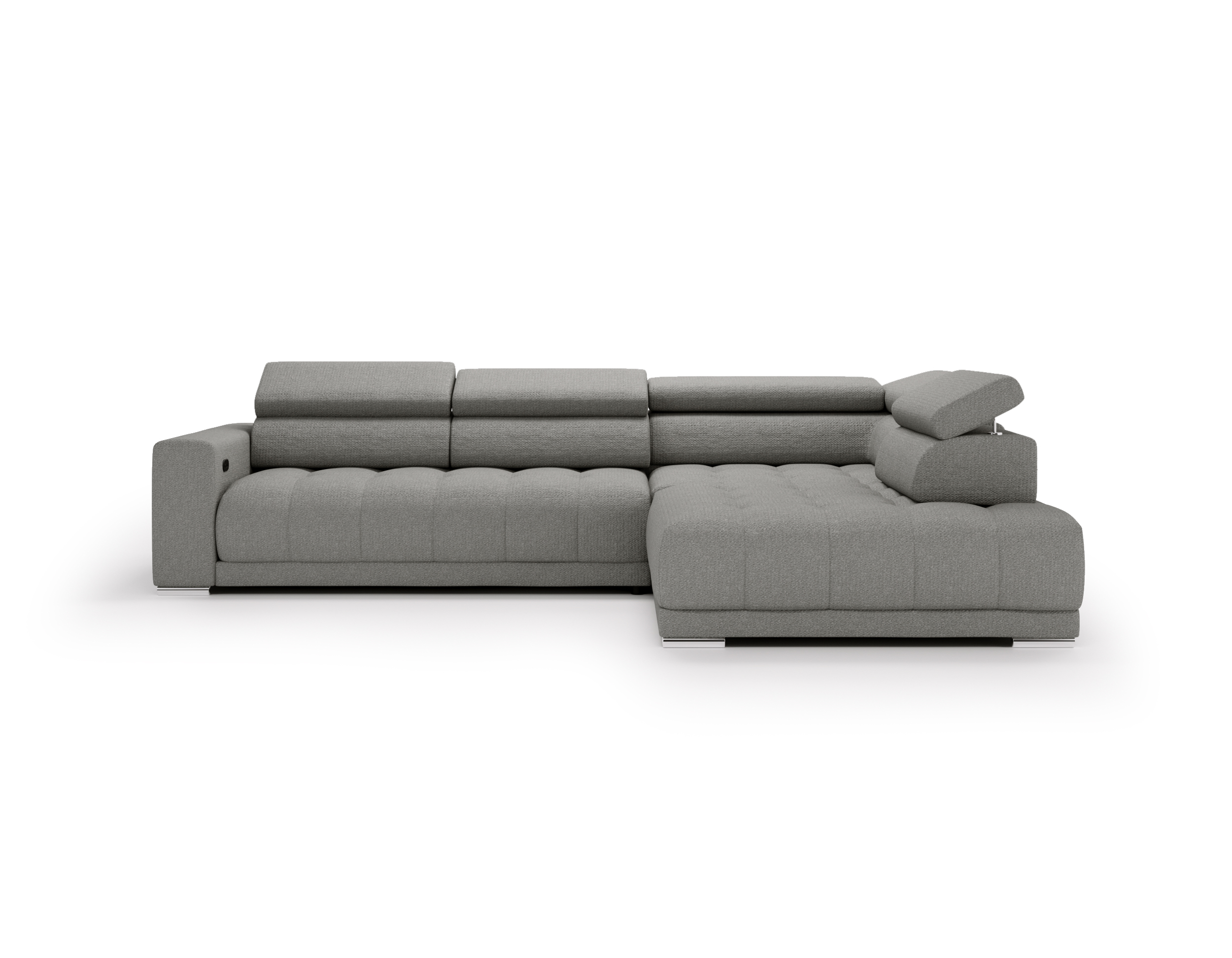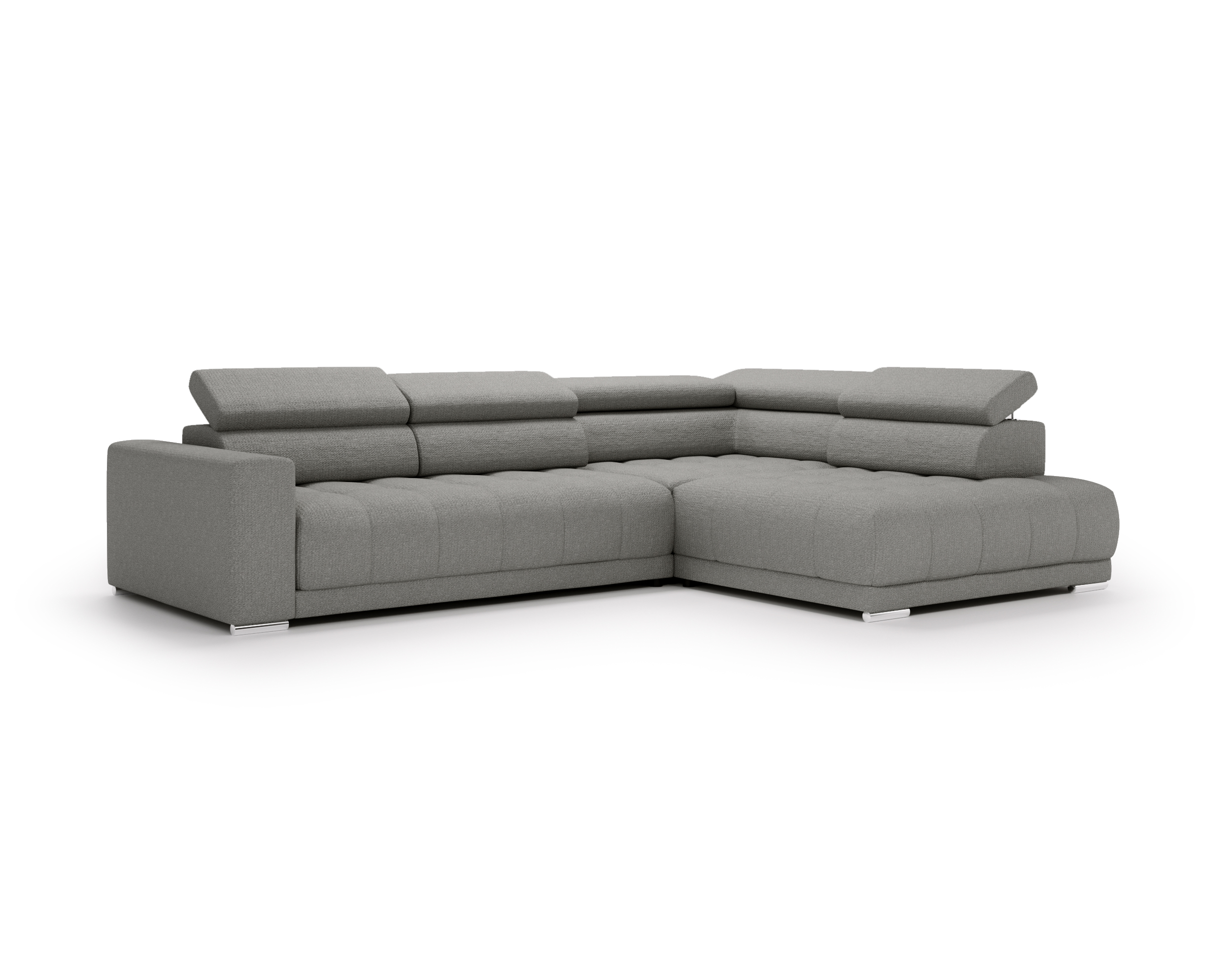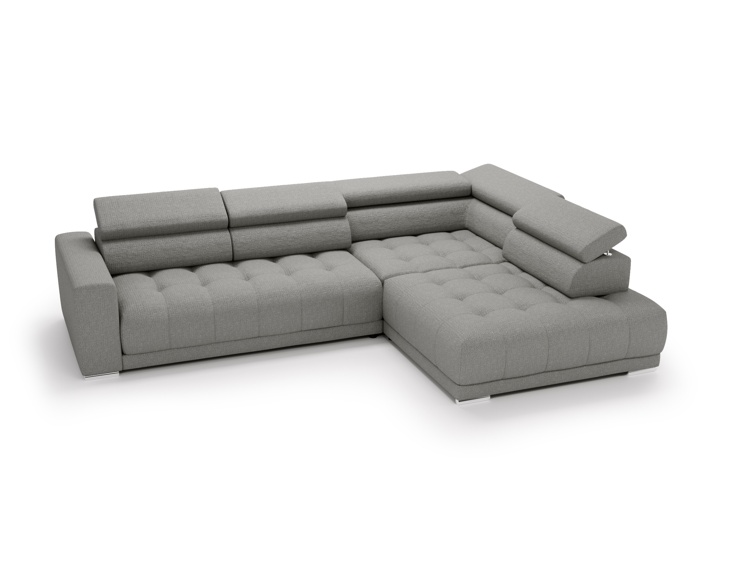 Nowoczesne detale – chromowane, owalne nóżki o wysokości 4,5 cm subtelnie podkreślają elegancki charakter narożnika.