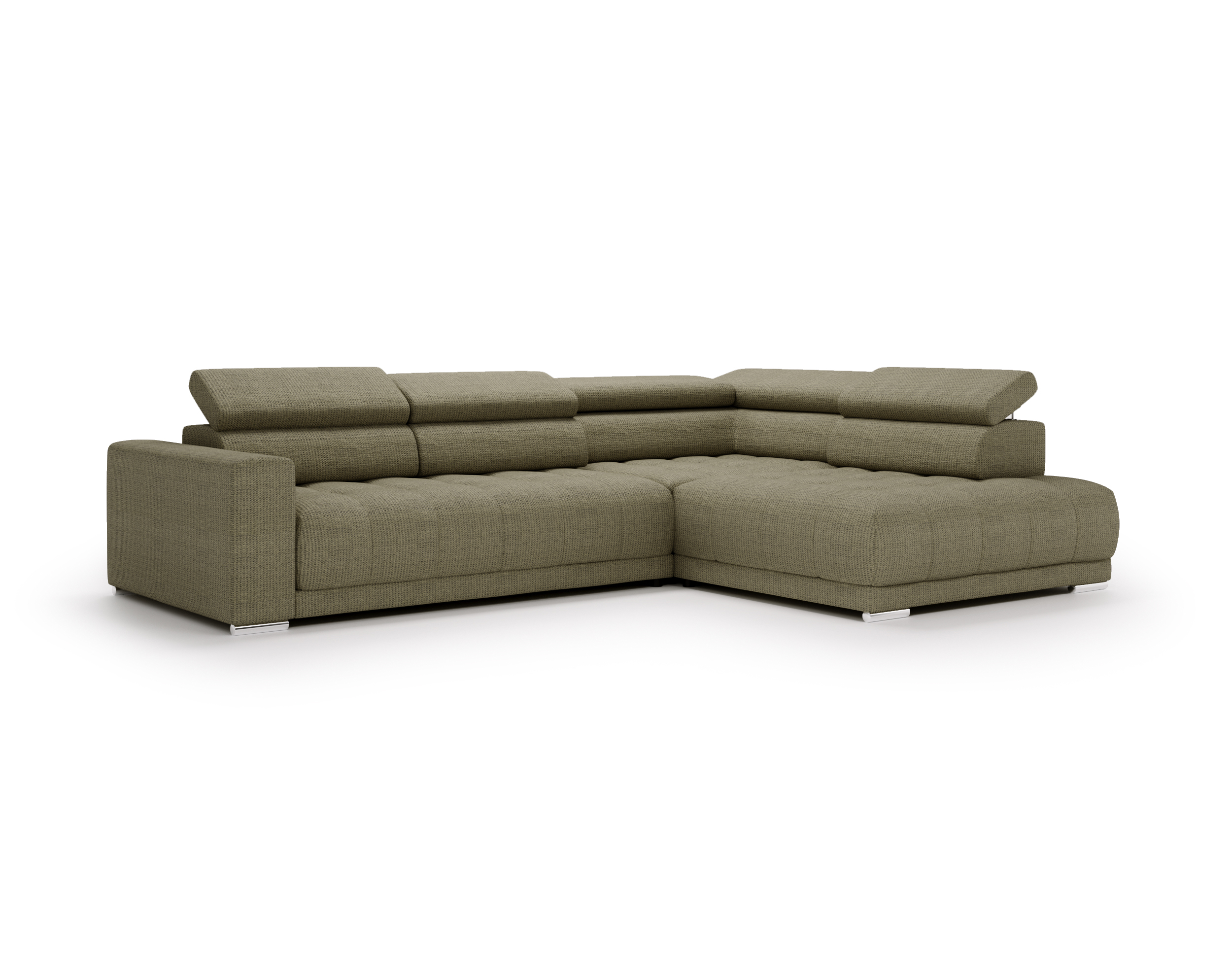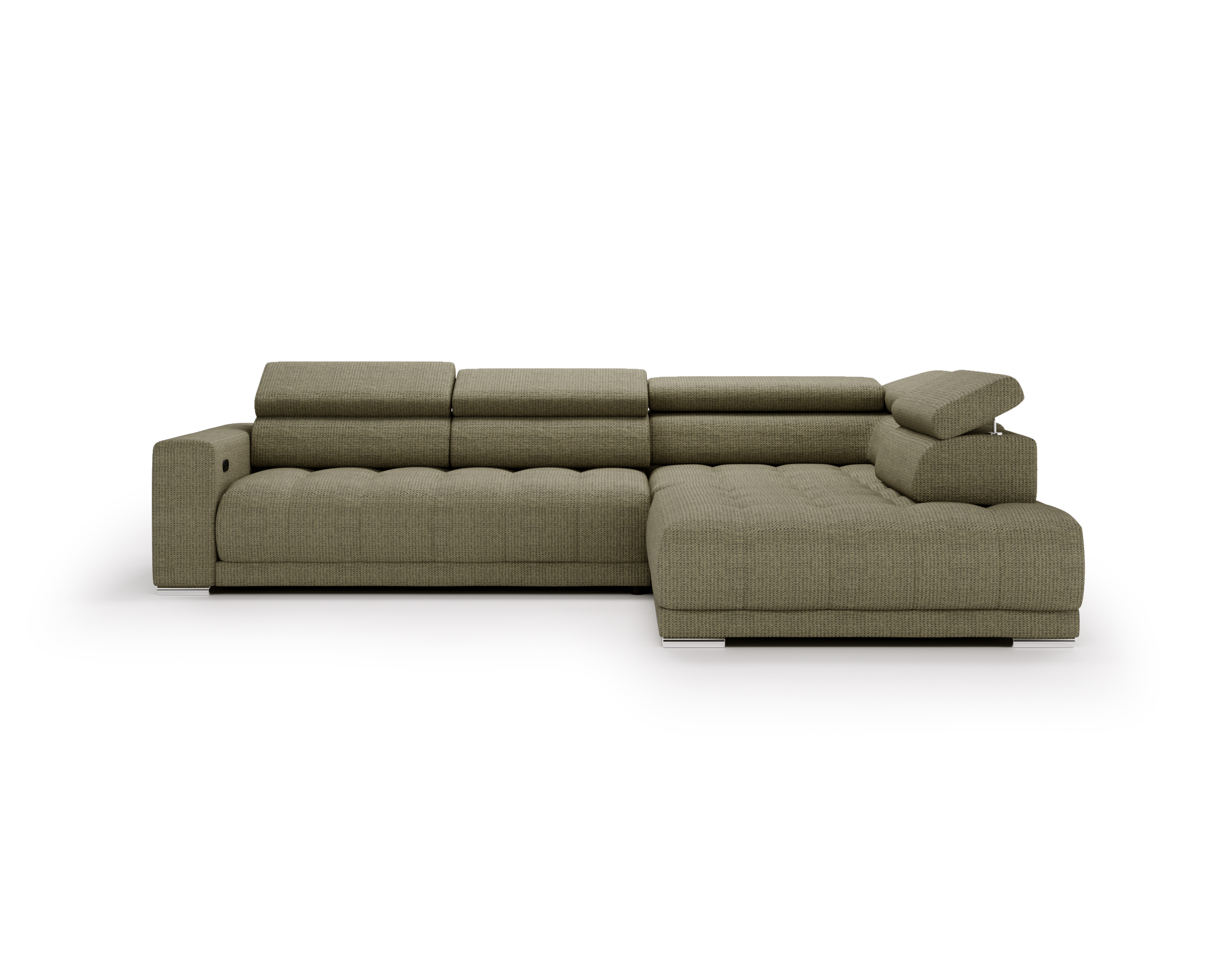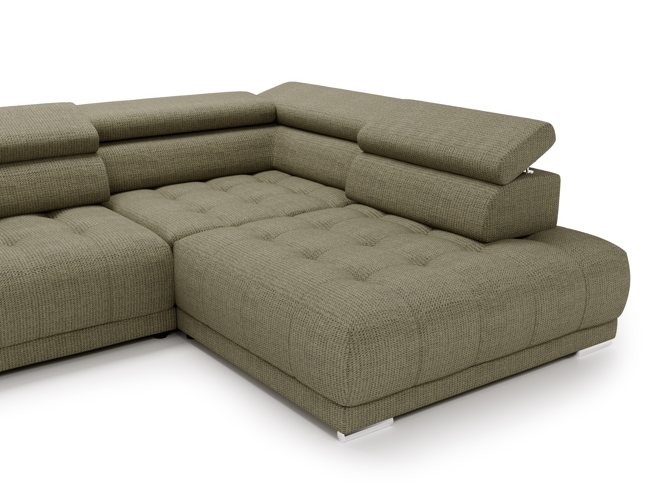 Nowoczesne detale – chromowane, owalne nóżki o wysokości 4,5 cm subtelnie podkreślają elegancki charakter narożnika.
