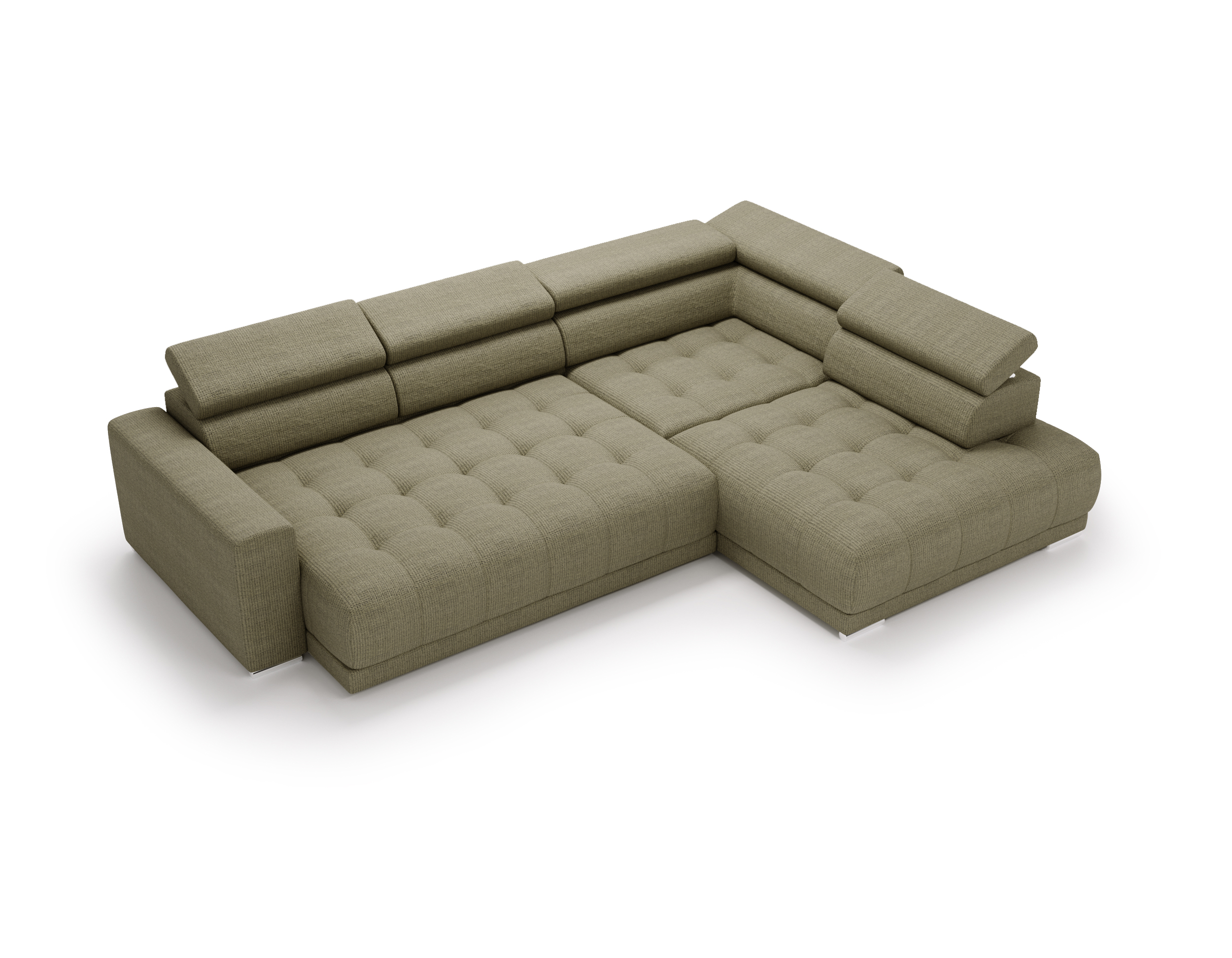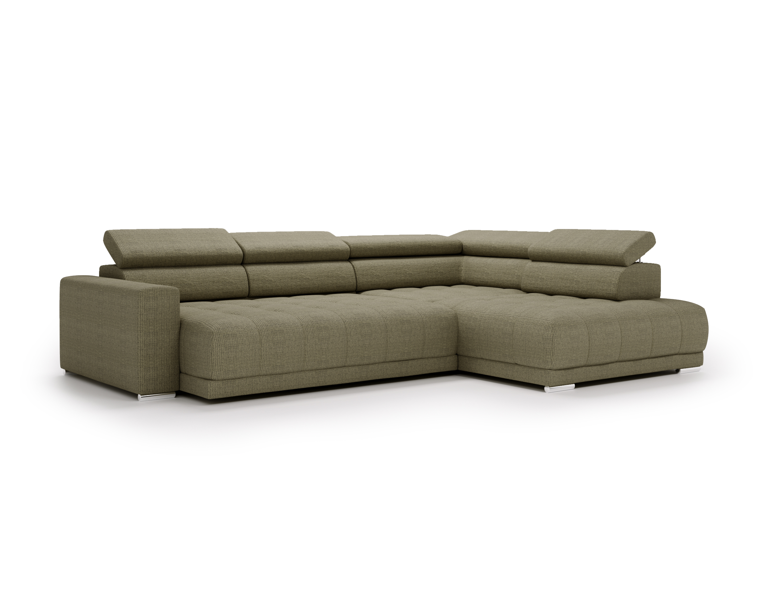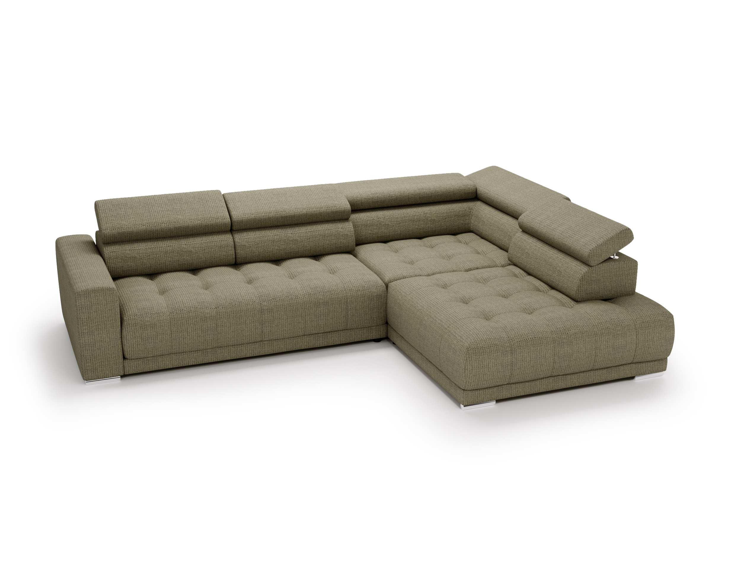 Nowoczesne detale – chromowane, owalne nóżki o wysokości 4,5 cm subtelnie podkreślają elegancki charakter narożnika.