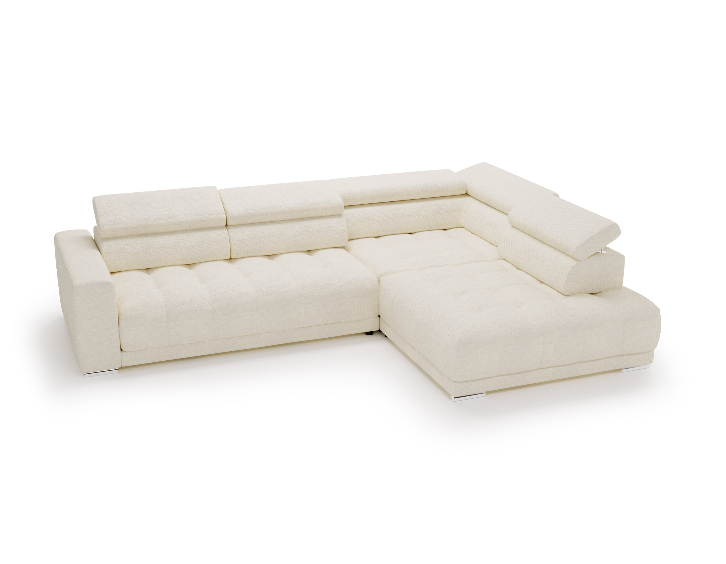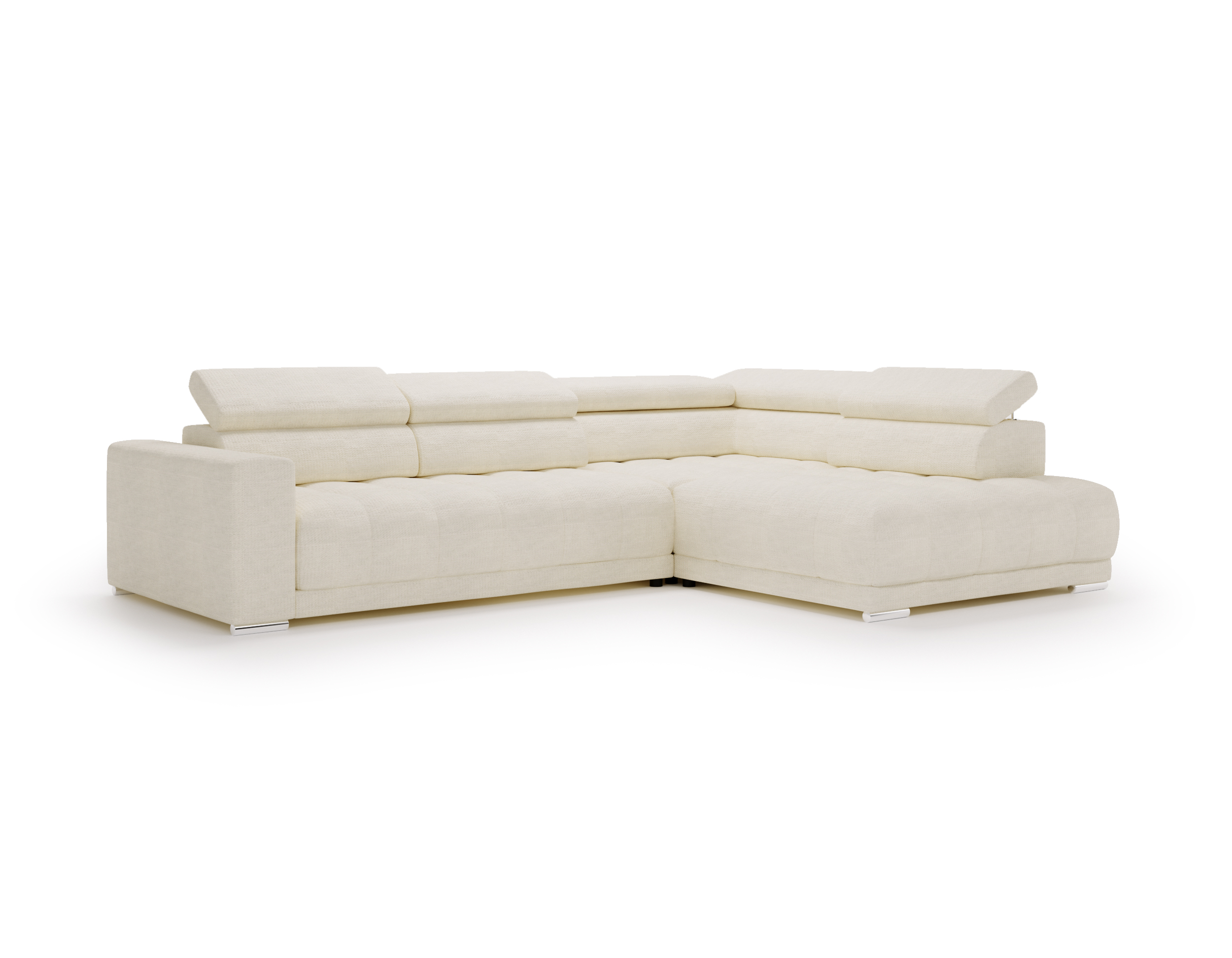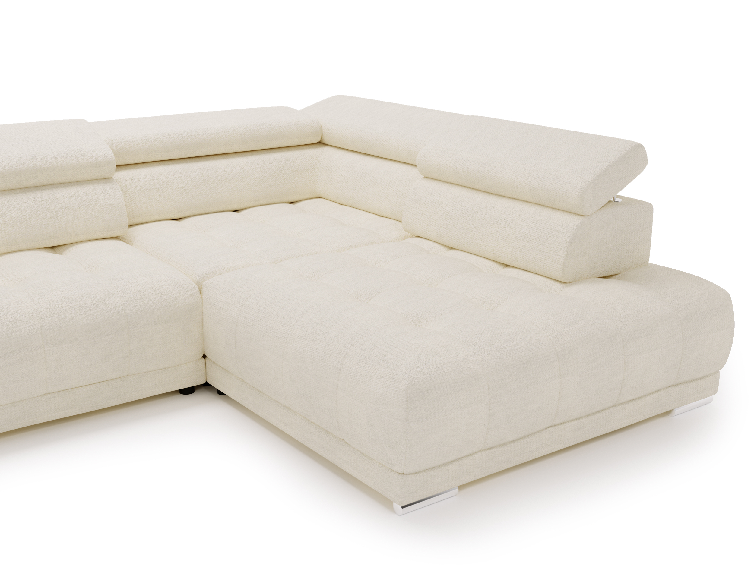 Nowoczesne detale – chromowane, owalne nóżki o wysokości 4,5 cm subtelnie podkreślają elegancki charakter narożnika.