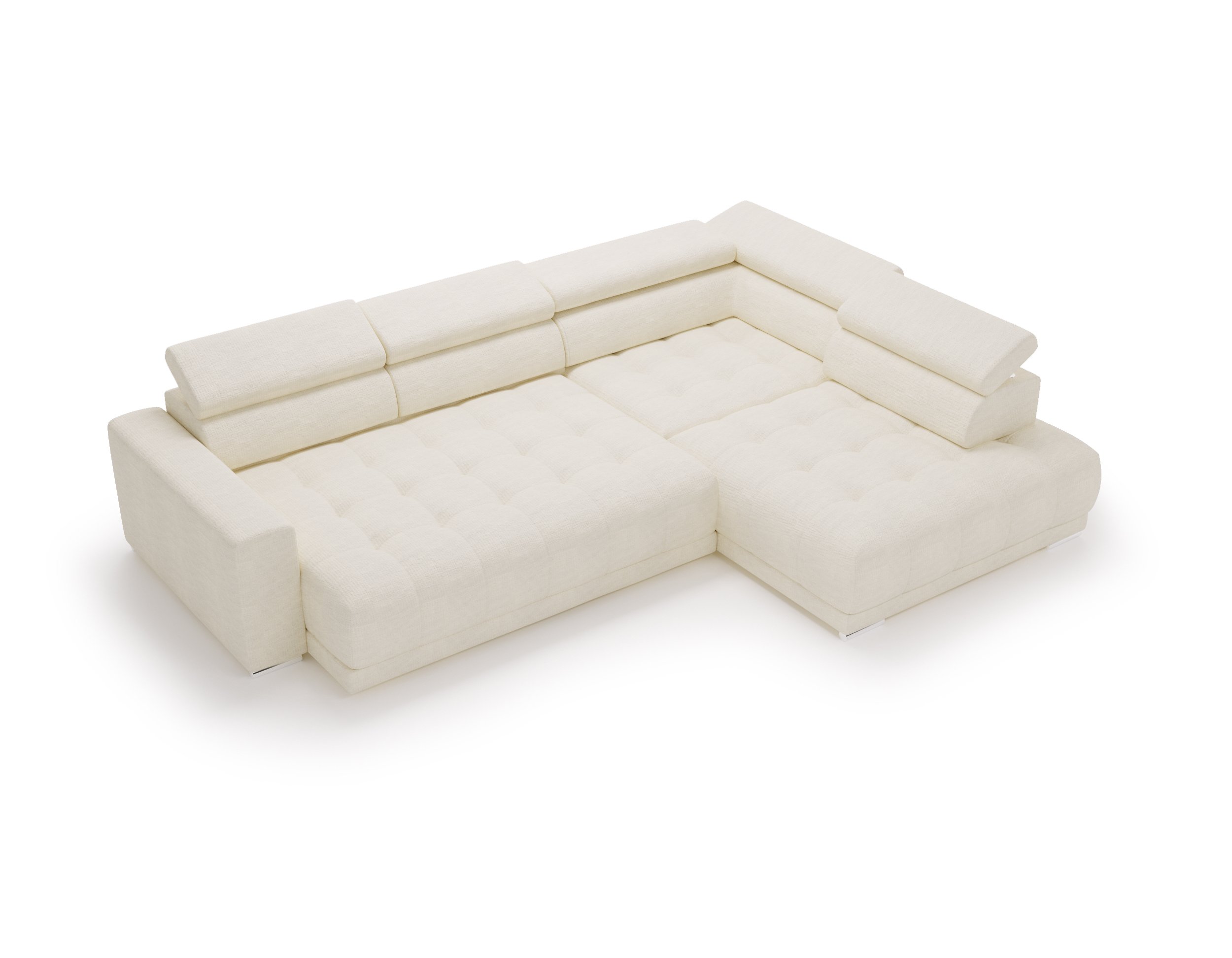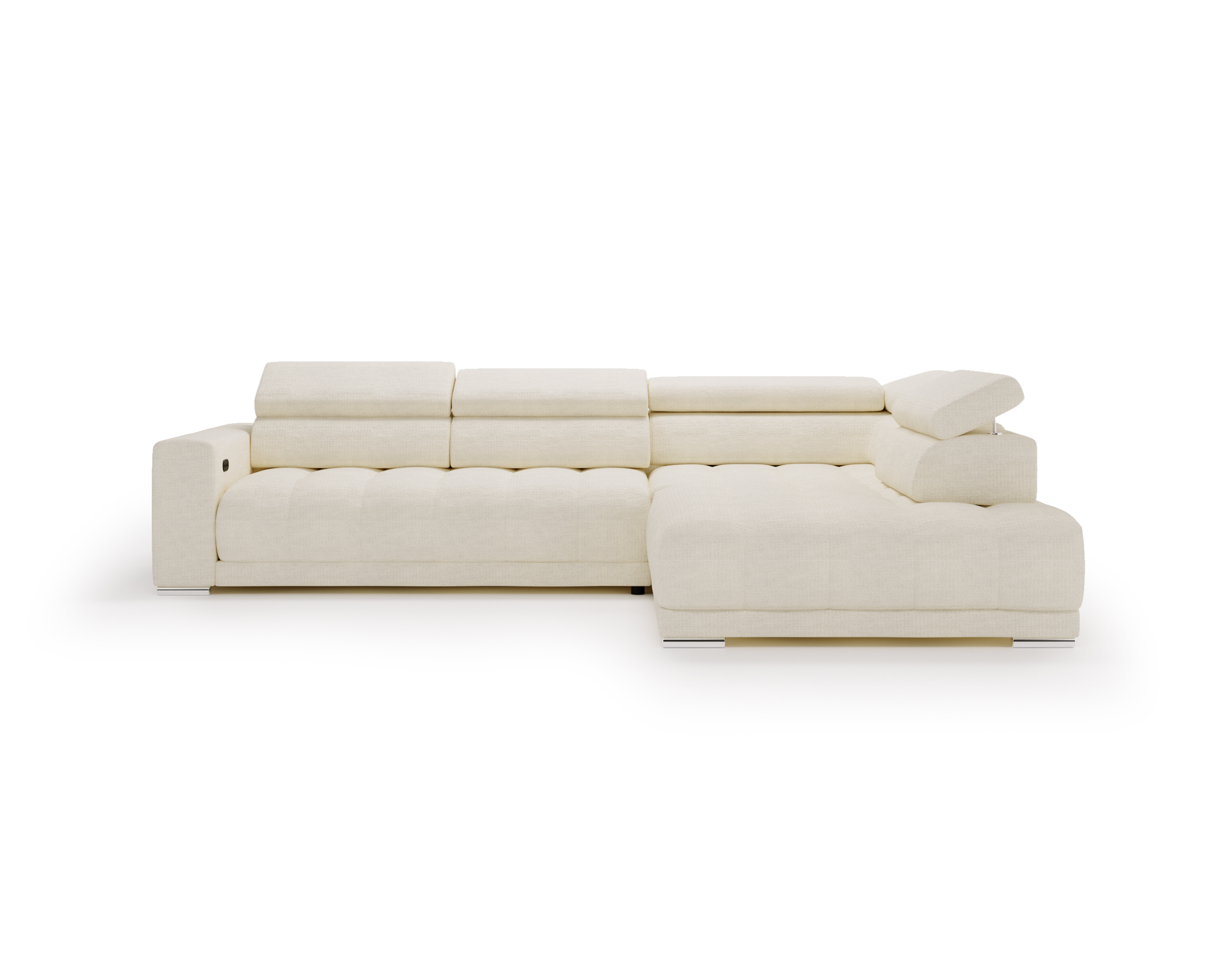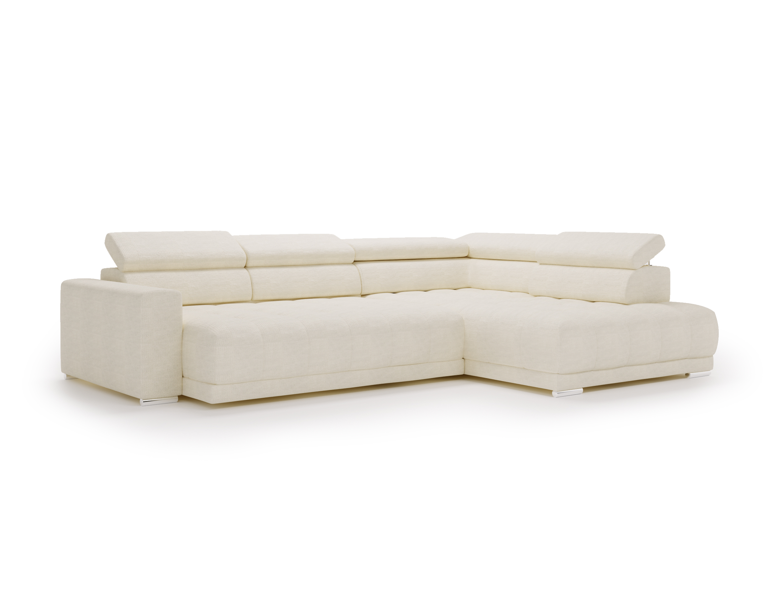 Nowoczesne detale – chromowane, owalne nóżki o wysokości 4,5 cm subtelnie podkreślają elegancki charakter narożnika.