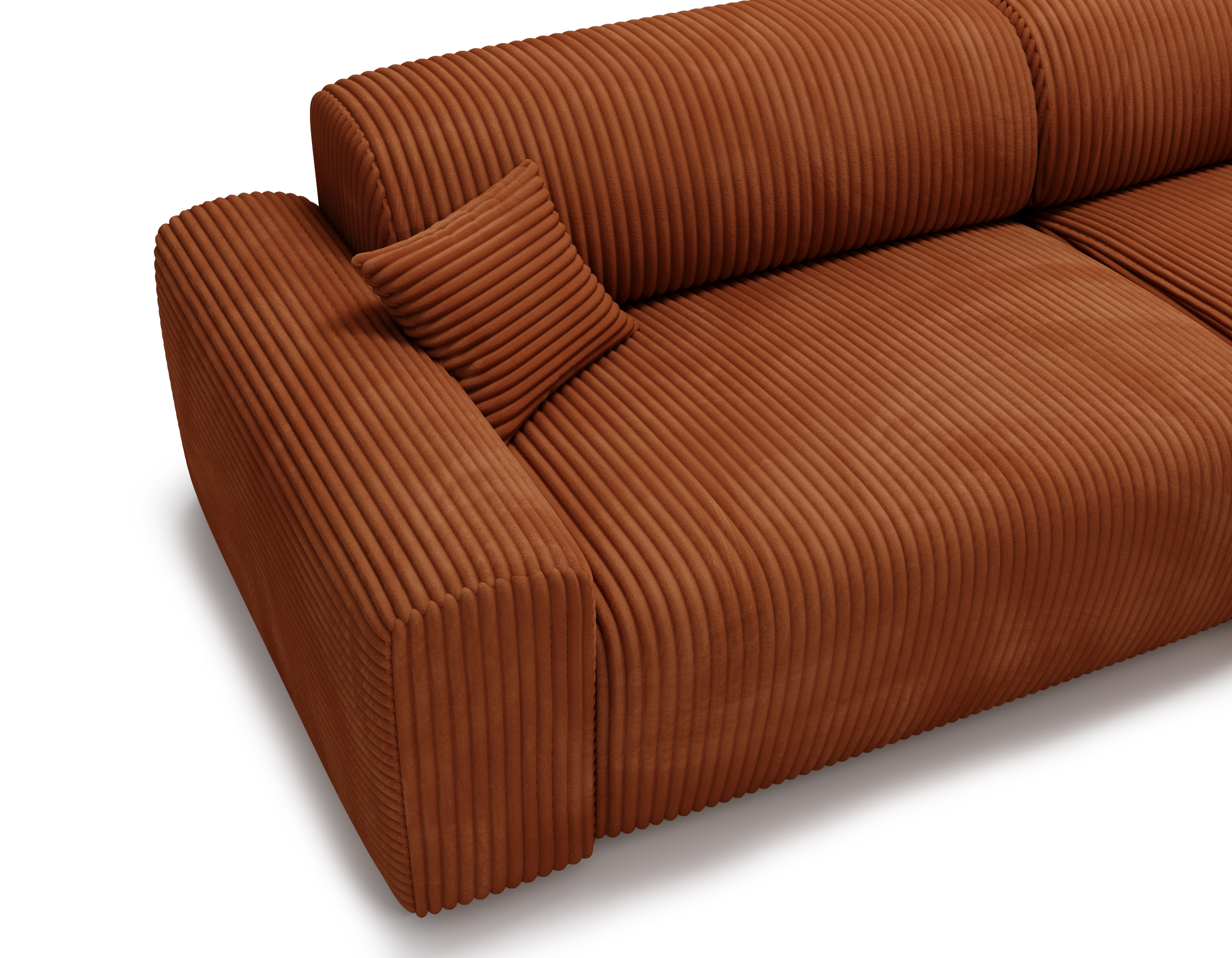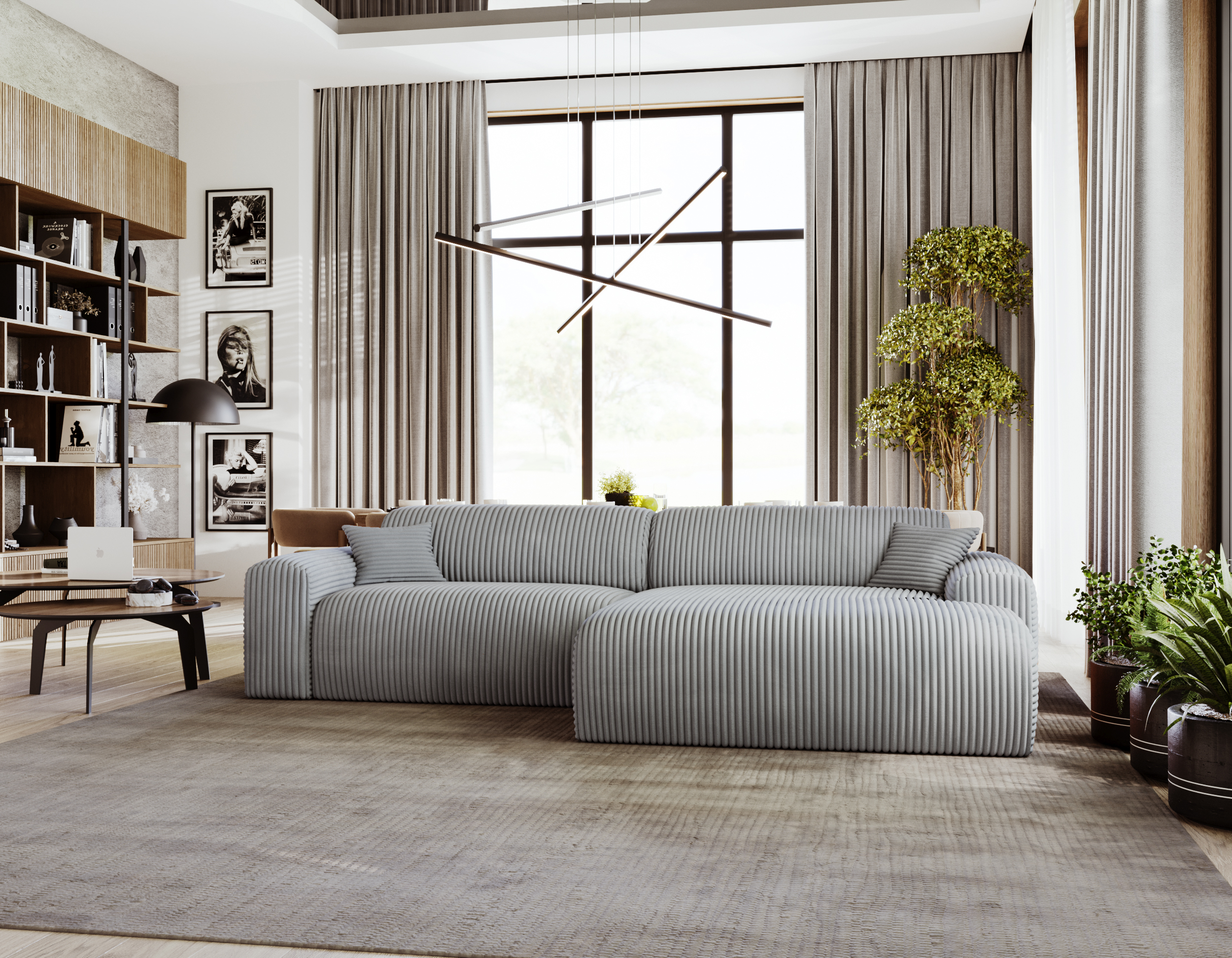 Połączenie pianki poliuretanowej oraz sprężyn falistych zapewnia optymalne podparcie ciała, elastyczność i wysoką odporność na odkształcenia. Wysokość siedziska gwarantuje komfort zarówno podczas codziennego wypoczynku, jak i wstawania. Duża powierzchnia narożnika w kształcie L pozwala wygodnie usiąść kilku osobom jednocześnie – bez kompromisów i ścisku.