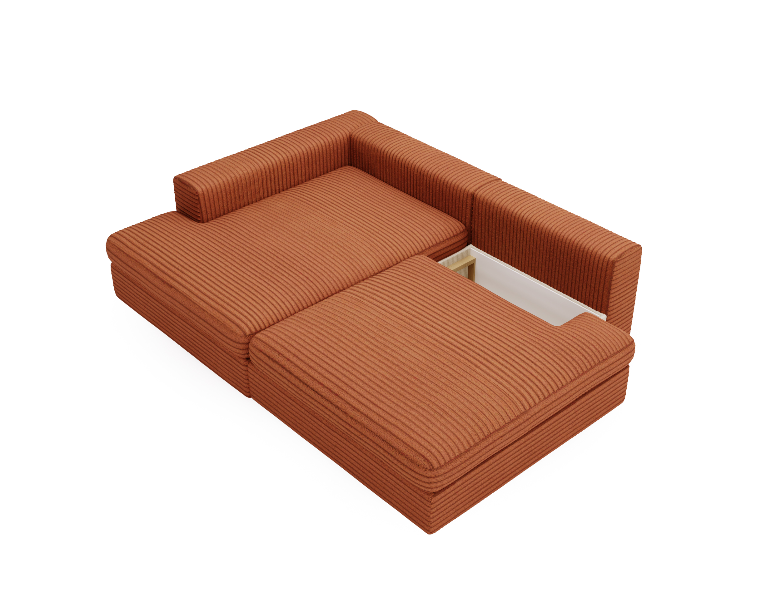 Wbudowany pojemnik na pościel pozwala wygodnie przechowywać kołdry, poduszki czy inne tekstylia, pomagając utrzymać porządek w salonie.