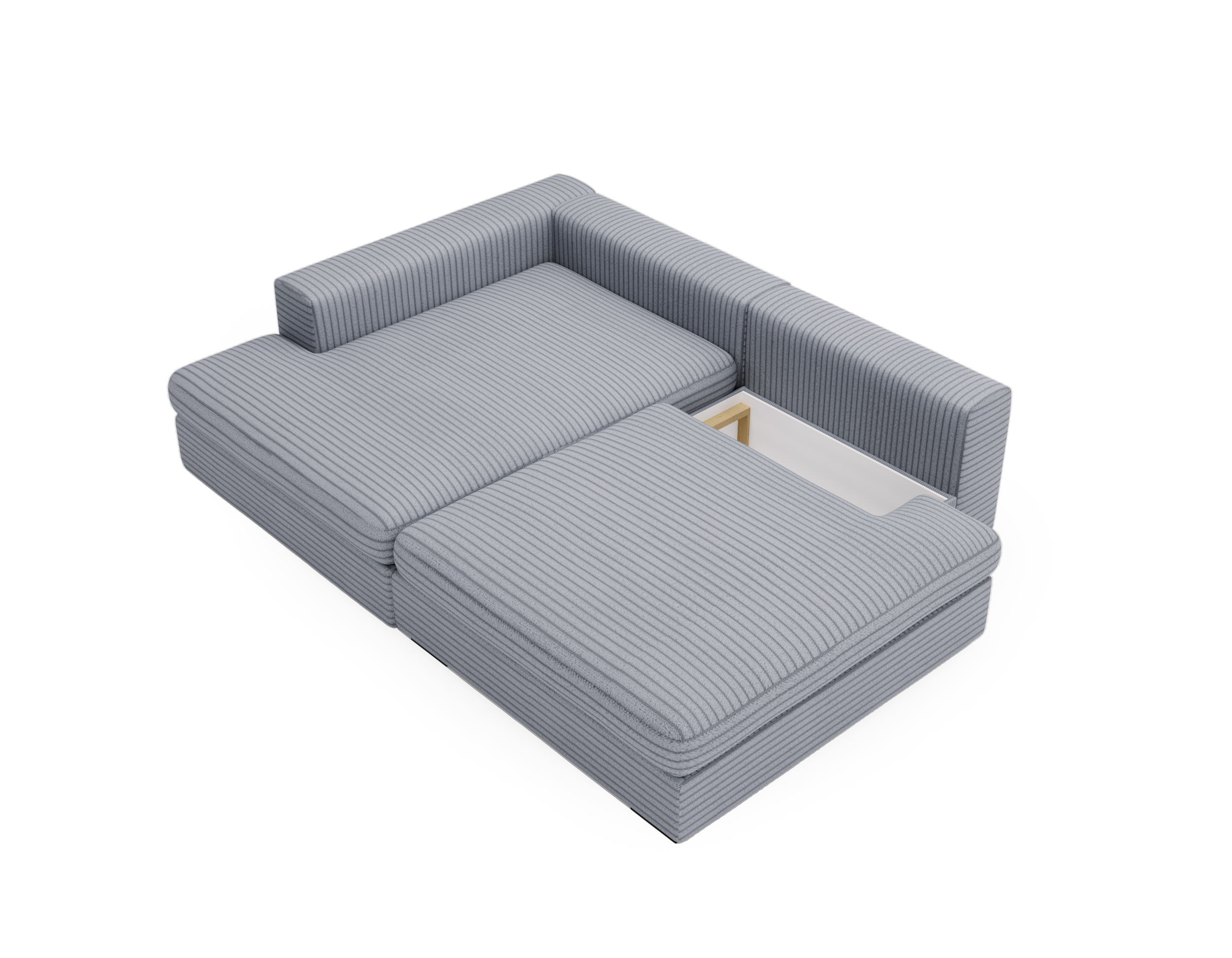 Wbudowany pojemnik na pościel pozwala wygodnie przechowywać kołdry, poduszki czy inne tekstylia, pomagając utrzymać porządek w salonie.